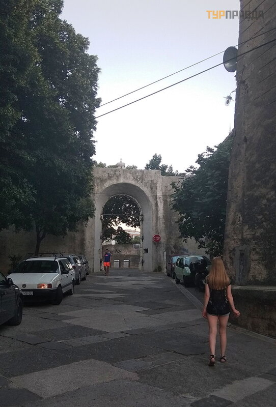 Gł ó wna brama w murze miejskim, któ rą nadal otacza Senj mał y>