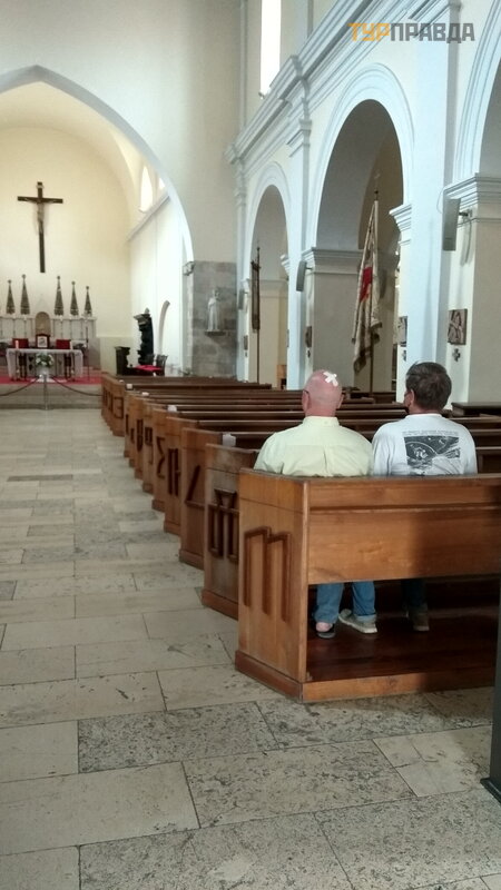 Podczas II wojny ś wiatowej został poważ nie uszkodzony. Spadł a na niego amerykań ska bomba. Ale starannie i poprawnie odrestaurowany. Wystró j wnę trza jest skromnie bogaty. Odbywają się tam koncerty, z jakiegoś powodu niezbyt popularne wś ró d turystó w. Poszliś my na sopran i organy. Za darmo. Saint-sans, Bach i inni