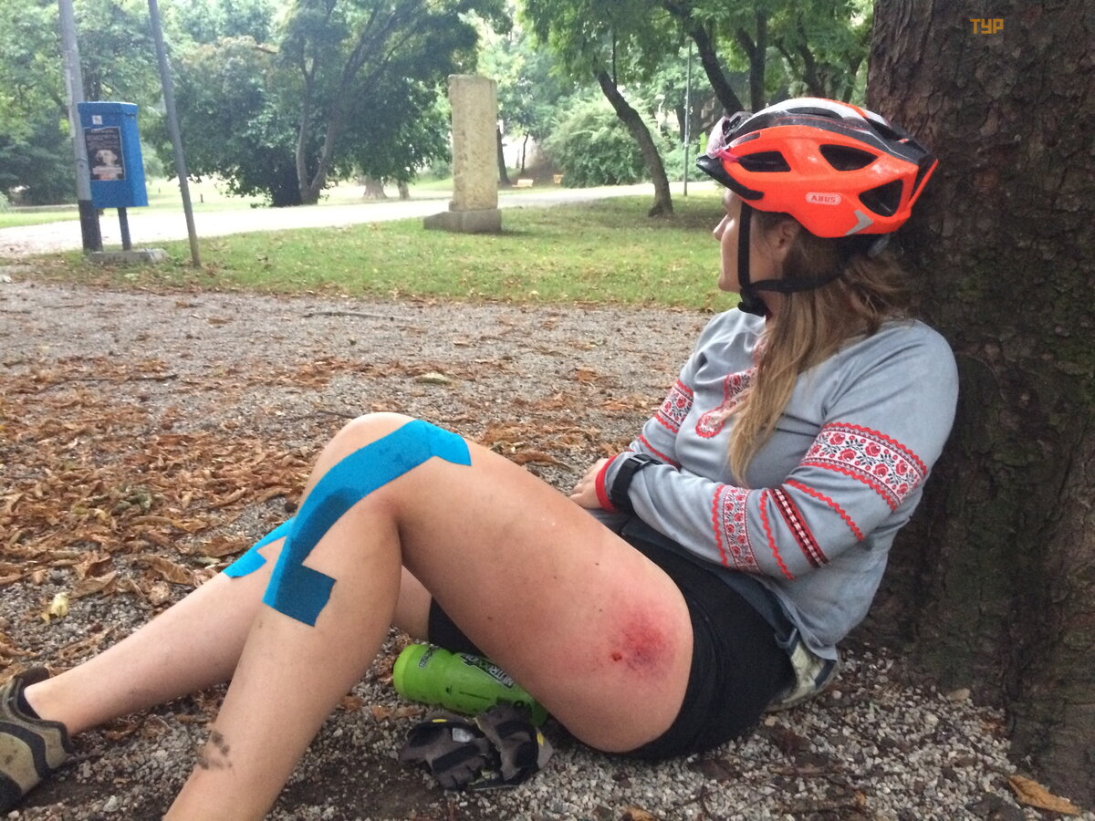 Katia ma obtarte udo, zabrudzoną koszulkę , posiniaczone ramię i boi się jazdy w deszczu.