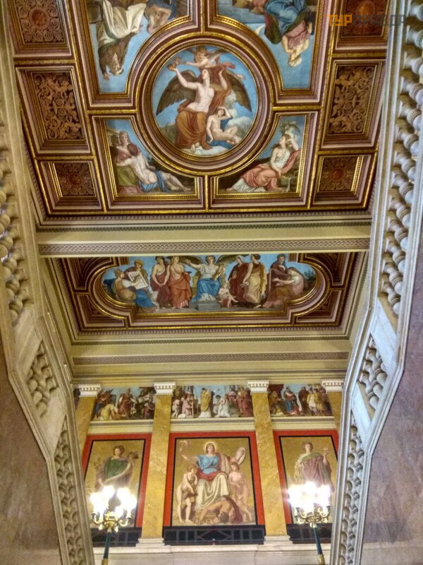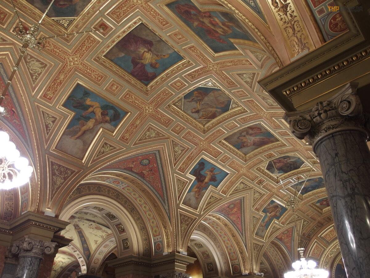 Wnę trze Opery w Budapeszcie jest nie mniej szykowne: ogromne ż yrandole, sufit ozdobiony freskami Karoly Lotza, foyer z marmurowymi kolumnami, jasnymi freskami i szerokimi frontowymi schodami. Malowidł o kopuł y przedstawiają ce Apolla na Olimpu wykonał Karoy Lotz. Bertalan Szekely i Mor Tan pracowali ró wnież nad wystrojem wnę trz. Wejś cie do lobby jest bezpł atne.
