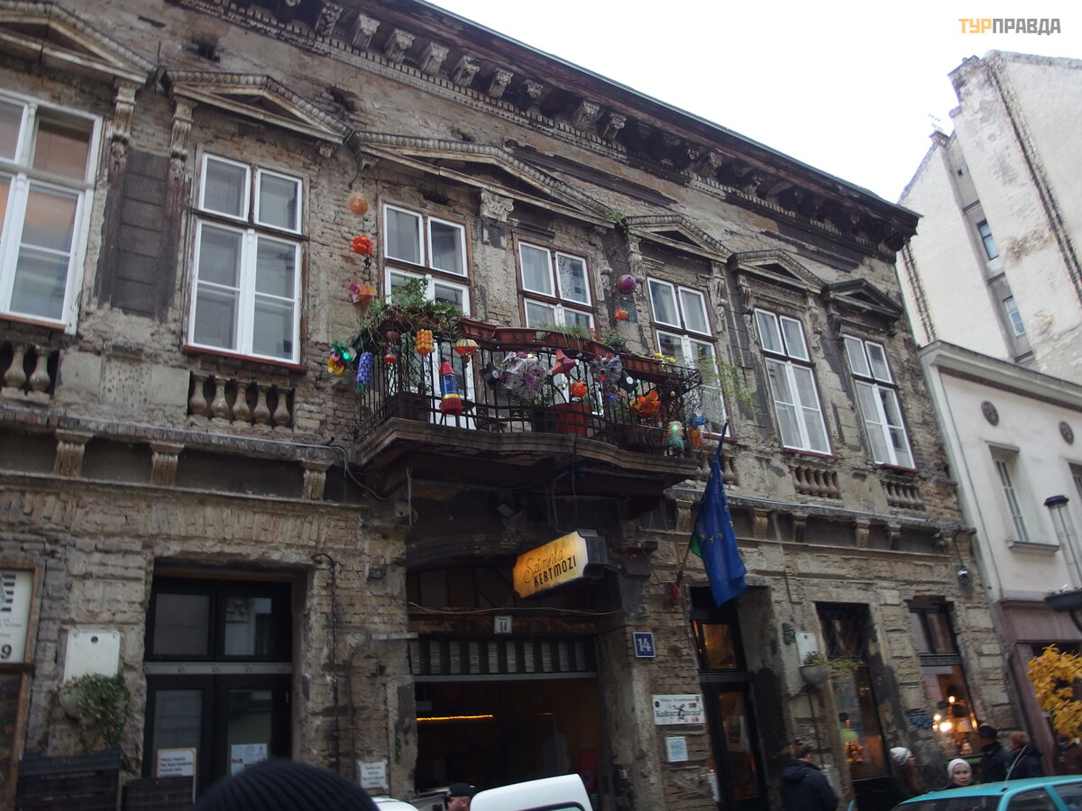 W czasie II wojny ś wiatowej na tym terenie utworzono getto, z któ rego sprowadzono 7.000 Ż ydó w do obozó w zagł ady. 2000 domó w został o otoczonych murem i oznaczonych ż ó ł tymi gwiazdami. Po wojnie wielu mieszkań có w opuś cił o teren. I pozostał opuszczony do 2000 roku. Wł adze miasta planował y wyburzenie tych budynkó w, ale nagle okazał o się , ż e miejsce to nie jest puste, a wrę cz przeciwnie, był o na nie popyt. Kilku kreatywnych mł odych ludzi z ograniczonymi ś rodkami finansowymi kupił o stary budynek i stworzył o w nim niezwykł e wnę trze. Stare meble, ksią ż ki, zabawki, szyldy, ubrania, w ogó le wszelkiego rodzaju ś mieci z kosza na ś mieci : ))) I tak narodził się cał y strumień ruin pubó w, któ re pó ź niej stał y się znakiem rozpoznawczym Budapesztu. A dzię ki temu udał o się uratować cał y obszar miasta.