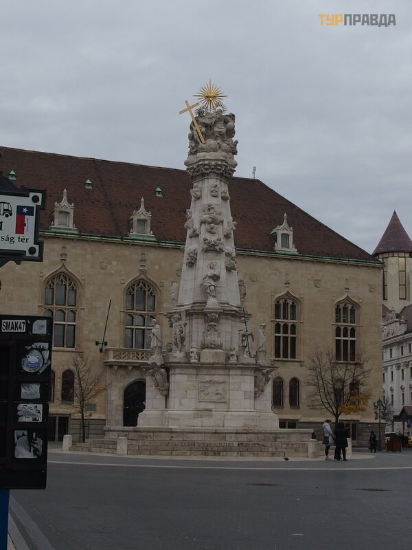 Po lewej stronie widać budynek Ratusza Staromiejskiego z wież ą zegarową na dachu zwień czoną cebulastą kopuł ą . Pod naroż nym balkonem ratusza, w niszy, znajduje się posą g Pallas Ateny, bogini sprawiedliwoś ci, wojny i mą droś ci, patronki nauk i rzemiosł a, a takż e patronki Budy.
