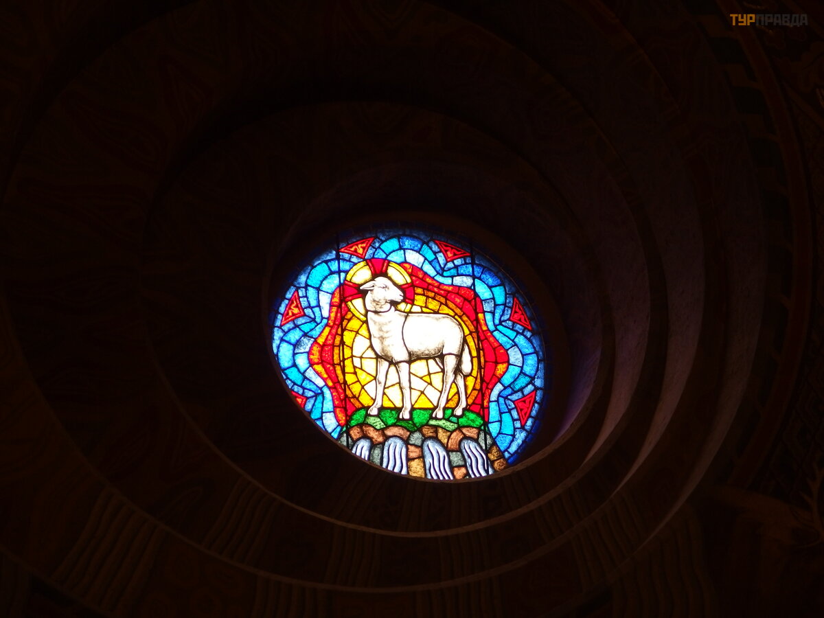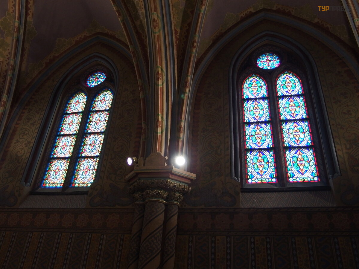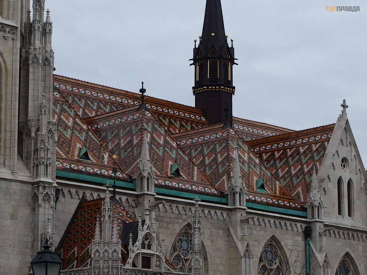 Na dachu koś cioł a ukł adane są kolorowe dachó wki ceramiczne ze sł ynnej fabryki Zholnai, któ re nadają mu elegancki i ś wią teczny wyglą d.