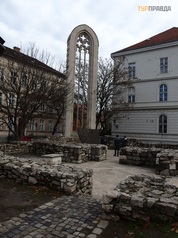 Wś ró d ruin wznosi się wież a i osobne gotyckie okno stoją ce na fundamencie. To wszystko, co odrestaurowano po II wojnie ś wiatowej z koś cioł a ś w. Marii Magdaleny, wybudowanego w latach 60-tych XIII wieku. Podczas panowania tureckiego koś ció ł został podzielony mię dzy protestantó w i katolikó w (niektó rzy modlili się w nawie, inni korzystali z chó ró w), a nastę pnie Turcy zamienili go w meczet.