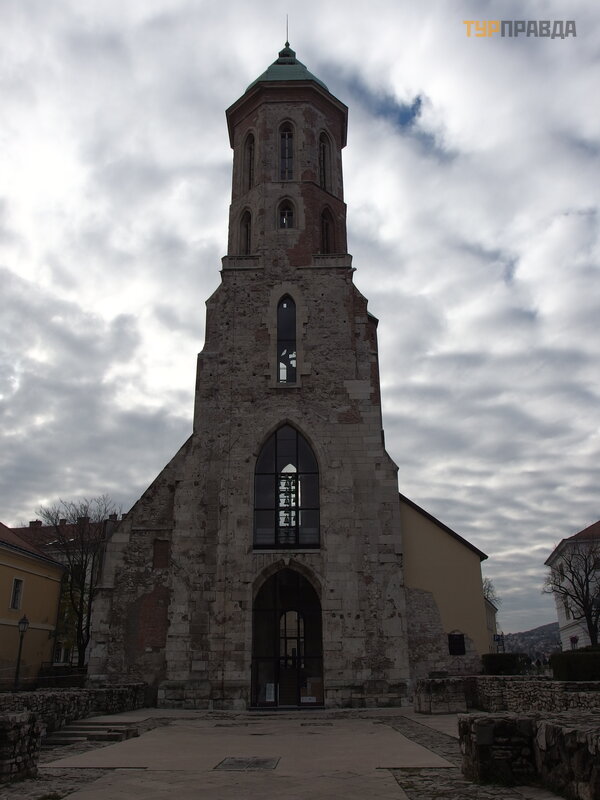Pierwszy koś ció ł został zbudowany przez Stefana Ś wię tego w XI wieku. Był poś wię cony Matce Boskiej. Podczas najazdu Tataró w mongolskich ś wią tynia został a zniszczona. Nową ś wią tynię , bę dą cą czę ś cią Zamku Budań skiego, zbudował kró l Bela IV. Z biegiem czasu koś ció ł był przebudowywany i rozbudowywany. W XV wieku osią gnę ł a swó j szczyt i stał a się najpię kniejszą gotycką ś wią tynią w kraju.