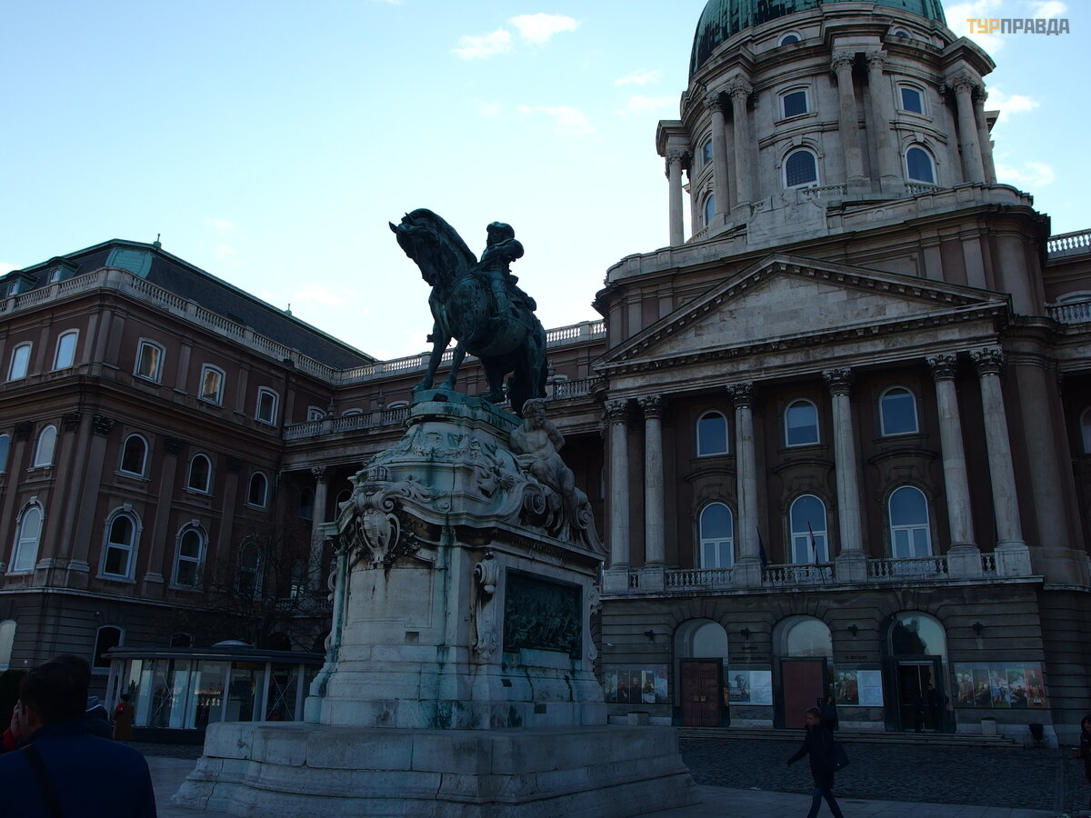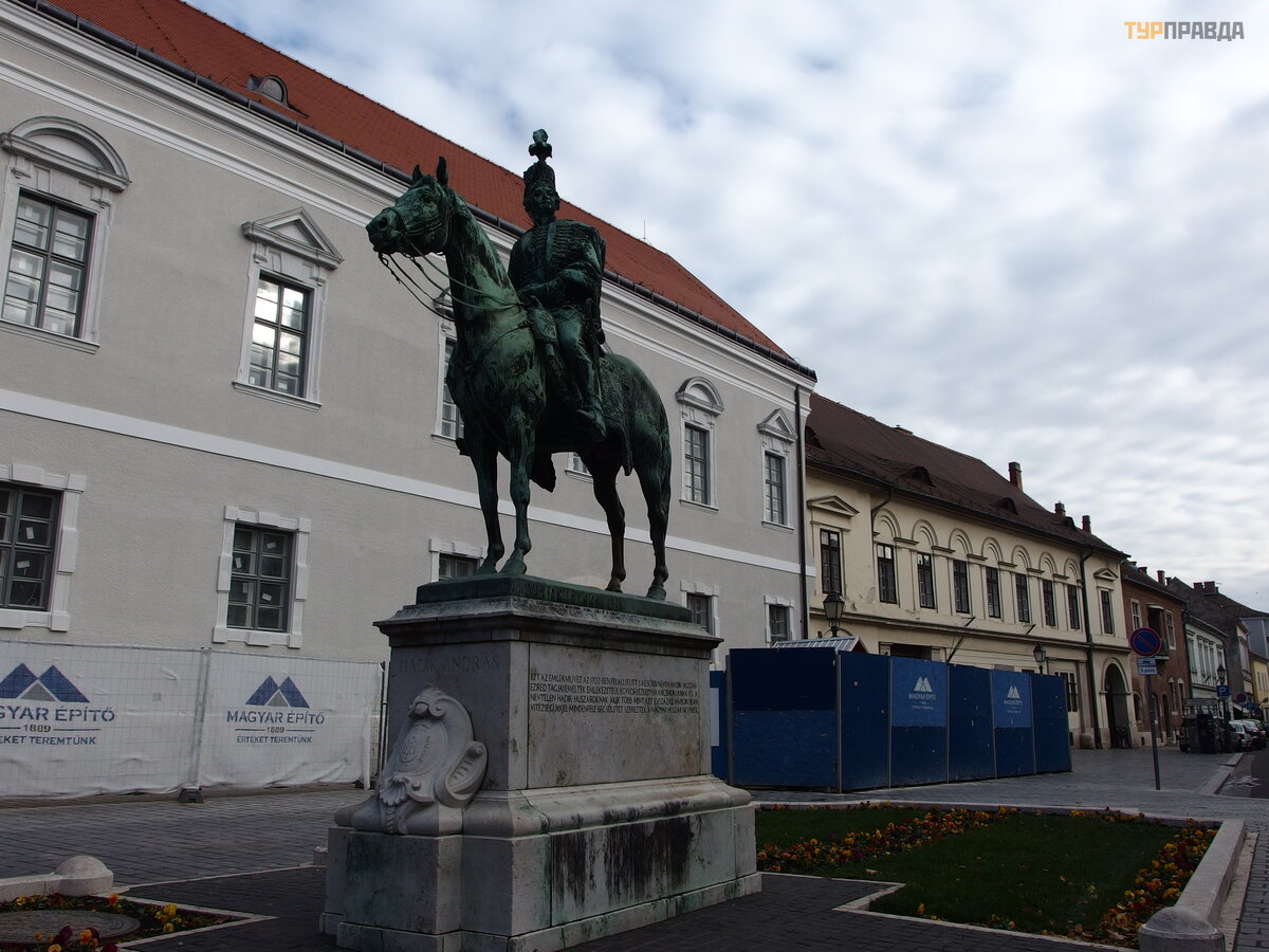 W centralnej czę ś ci Pał acu Kró lewskiego znajduje się pomnik księ cia Eugeniusza Sabaudzkiego autorstwa Jó zsefa Ró ny (Jó zsef Ró na, 1900), upamię tniają cy zwycię ską bitwę pod Zenta (1697), któ ry stał się kluczowym momentem w dział aniach wojennych z Turkami i przyczynił się do zawarcia pokoju karł owickiego w 1699 roku. Ksią ż ę powstrzymuje gorliwego konia, na któ rego kopytach drż ą ze strachu pojmani Turcy. Sceny bitwy odzwierciedlają pł askorzeź by na cokole: armia Eugeniusza Sabaudzkiego zaatakował a wojska suł tana Mustafy II podczas przekraczania Cisy i pokonał a ją , mimo znacznej (prawie dwukrotnej) przewagi liczebnej Turkó w. Pomnik został wzniesiony w 1900 roku dzię ki finansowemu wsparciu cesarza Franciszka Jó zefa, któ ry musiał interweniować , gdy stał o się jasne, ż e miasto po prostu nie ma wystarczają cych ś rodkó w.