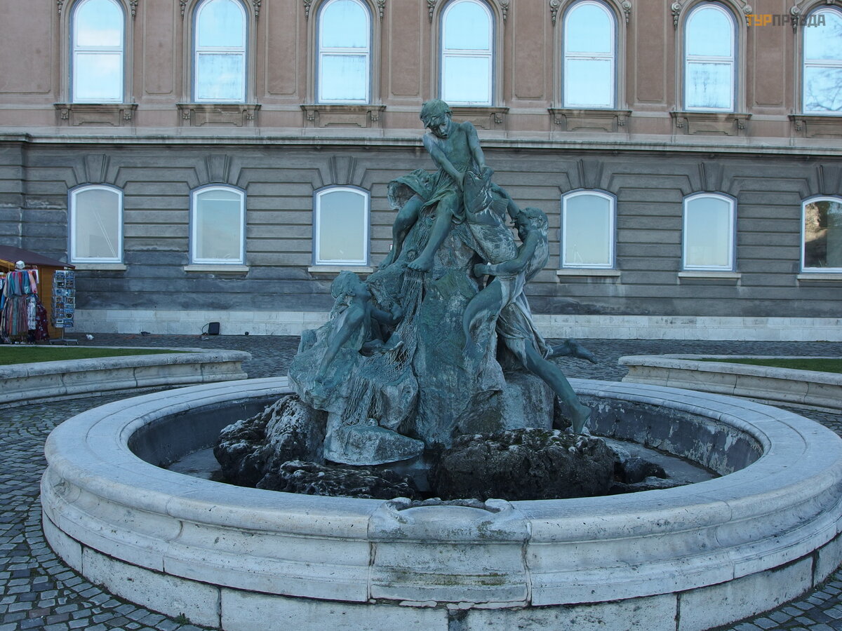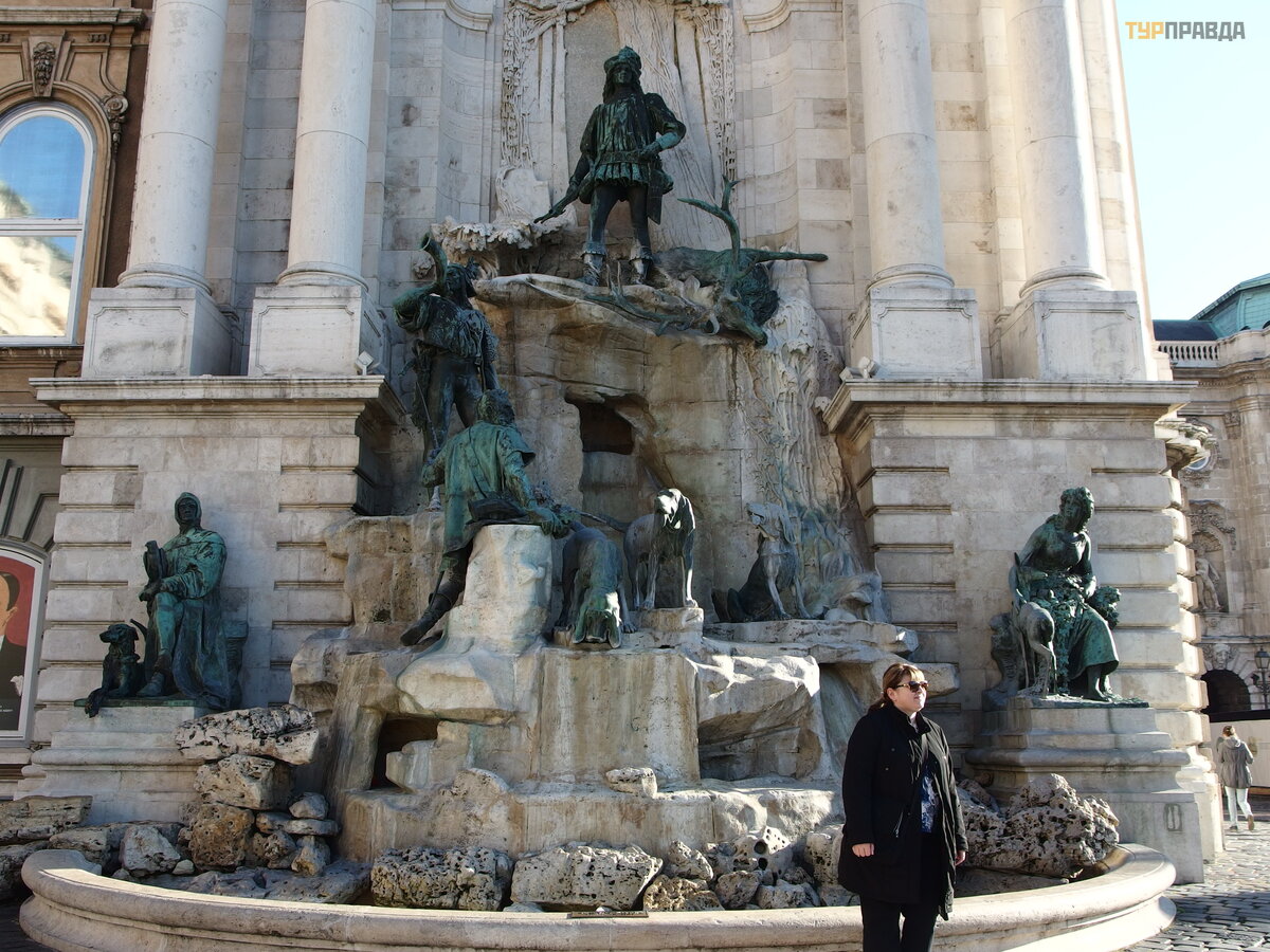 Na zachodnim dziedziń cu Pał acu Kró lewskiego znajduje się wspaniał a fontanna przedstawiają ca polowanie kró la Macieja (rzeź biarz Alajos Strobl, Alajos Stró bl, 1904). Legenda gł osi, ż e podczas polowania Maciej, któ ry lubił ubierać się w proste stroje, spotkał pię kną Ilonkę , któ ra zakochał a się w nim, nie zdają c sobie sprawy, ż e kró l jest przed nią . Kompozycja powstał a na podstawie ballady Mihaly'ego Vö rö smarty'ego. Po lewej kronikarz kró la Macieja (z sokoł em). To on jako pierwszy spisał tę romantyczną legendę , któ rą pó ź niej literacko przetworzył Vö rö smarty. Po prawej ten sam lud, Ilonka Pię kna. Jak gł osi legenda, dowiedziawszy się , ż e jej wybranka nie jest zwyczajną osobą i nie moż na mię dzy nimi mó wić o ż adnej mił oś ci, zakochana dziewczyna zwię dł a i umarł a. Rzeź biarz przedstawił innych myś liwych, oczywiś cie z orszaku kró lewskiego, w peł nym rynsztunku ró g myś liwski i kolejne martwe zwierzę Fontanna to kawał ek skał y z wodospadem, na któ rym stoi sam kró l, u jego stó p leż y martwy jeleń , a obok biegną policjanci, z któ rych jeden zdaje się pić woda z fontanny.