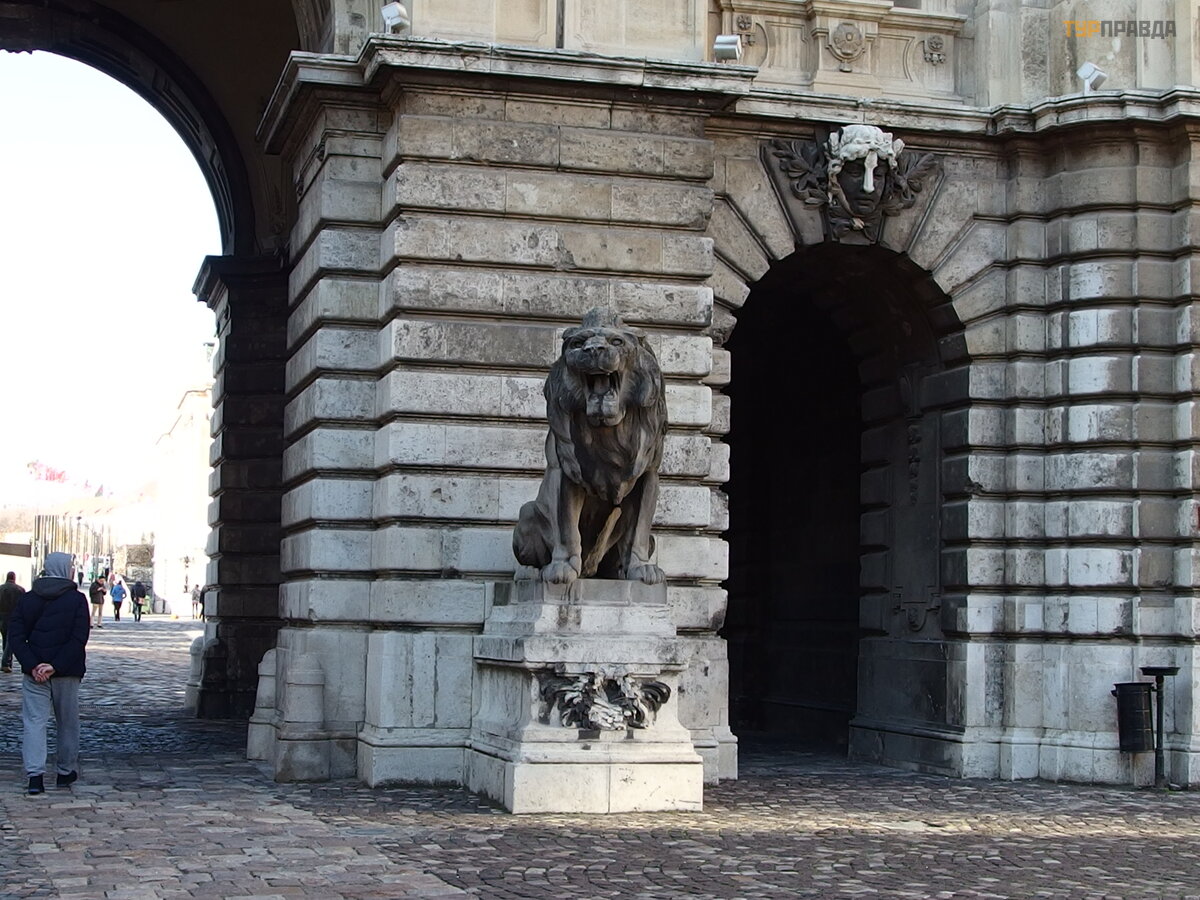 Bardzo blisko fontanny moż na zobaczyć Bramę Lwa — ł uk prowadzą cy na dziedziniec Pał acu Kró lewskiego. Po obu stronach bramy siedzą lwy z zamknię tymi pyskami. Dokł adnie te same lwy, ale z otwartymi pyskami, są po drugiej stronie ł uku.