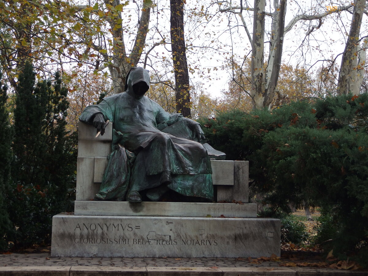Naprzeciwko gł ó wnej fasady pał acu znajduje się pomnik kronikarza zwanego Anonimem (1903, Mikló s Ligeti), któ ry ż ył pod koniec XII - począ tek XIII wieku. Jego kroniki opowiadają o wczesnym okresie historii Wę gier, w tym o pozyskaniu przez Wę gró w nowej ojczyzny. W parku znajduje się wiele pomnikó w znanych osobistoś ci. Tak wię c na przykł ad obok wyspy, na któ rej znajduje się kompleks zabytkowych budynkó w, w 1906 r. wzniesiono pomnik pierwszego amerykań skiego prezydenta Jerzego Waszyngtona (1732.1799) (1906, Gyula Bezeredi). Ten pomnik powstał dzię ki darowiznom Wę gró w, któ rzy wyemigrowali do Ameryki w XIX wieku.