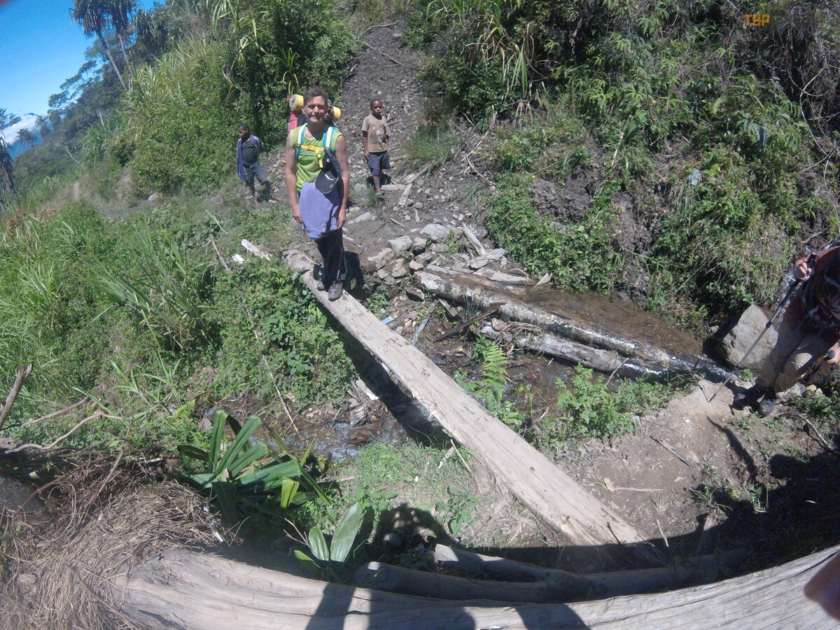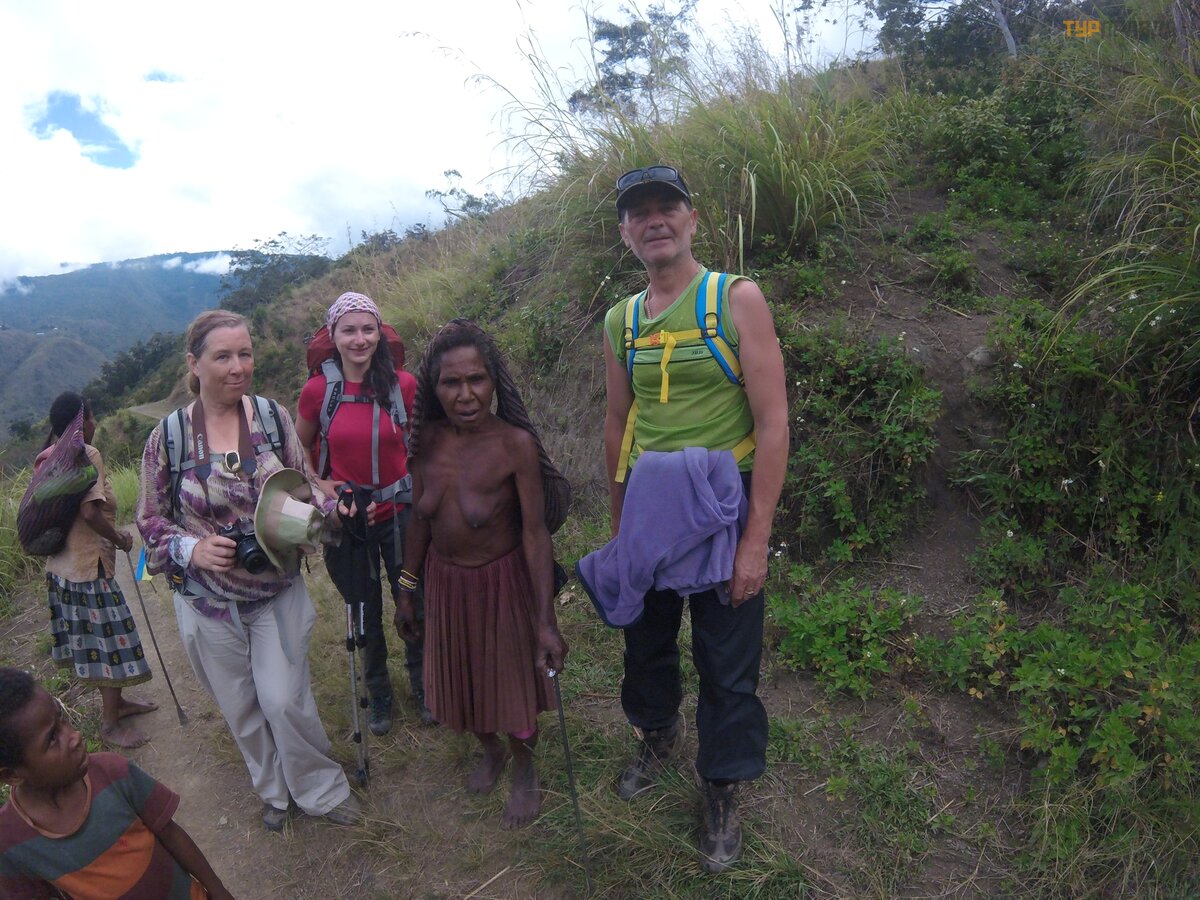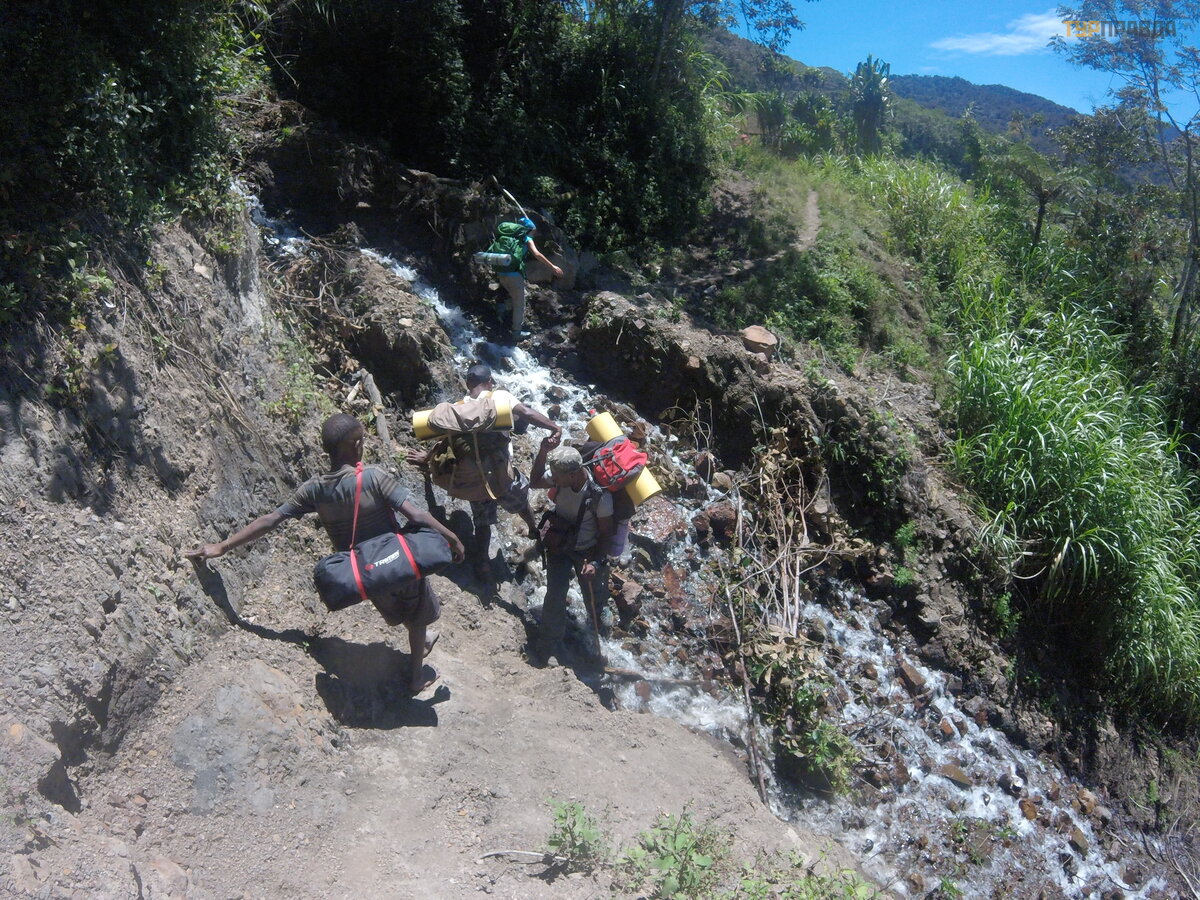 dostał drugi wiatr! Dzisiejsza trasa prowadzi przez dż unglę , nie bę dzie już palą cego sł oń ca. Skoń czył y nam się zapasy wody pitnej, wię c dostaliś my filtry wojskowe i manierki. Wodę moż na czerpać nawet z bagna, co zrobiliś my. Ale filtró w nie dano tragarzom i chociaż byli miejscowi i przyzwyczajeni do swojej wody, rozwinę li biegunkę , uratowaliś my ich naszym wę glem aktywowanym, ale byli bladzi i z 3 tragarzy z naszą grupą opó ź nioną pozostał tylko jeden Raymond . Bardzo czę sto w gó rach na wą skich ś cież kach spotykaliś my miejscową ludnoś ć , któ ra zawsze witał a nas za rę kę albo z badi albo bagi, idą na piechotę do Wameny na bazar po prowiant i z powrotem na gł owę , tymi kozimi ś cież kami nosić cię ż kie torby na zakupy z jedzeniem, z dzieć mi, wodą i garnkami. Oglą danie ich to przyjemnoś ć , chodzisz prawie na pł ucach i oddychasz, w specjalnych butach, w kombinezonach, a oni są boso, a ich nogi są jak pł etwy i ciuchcią ,