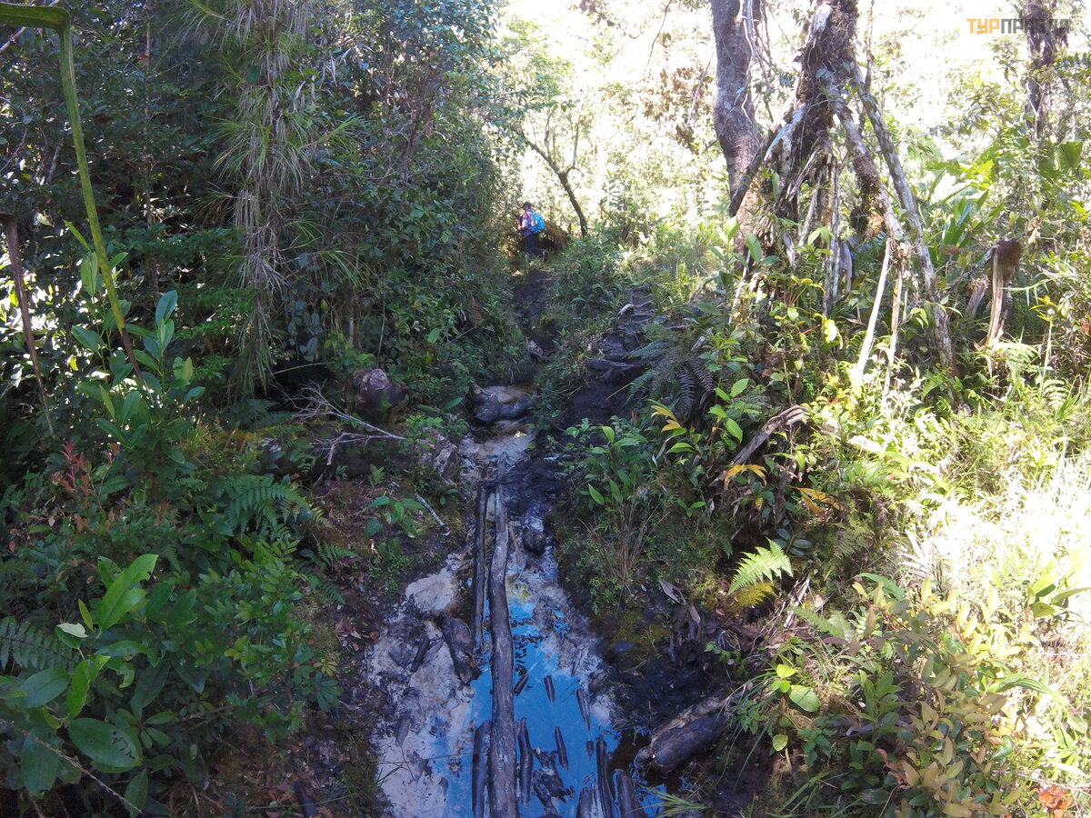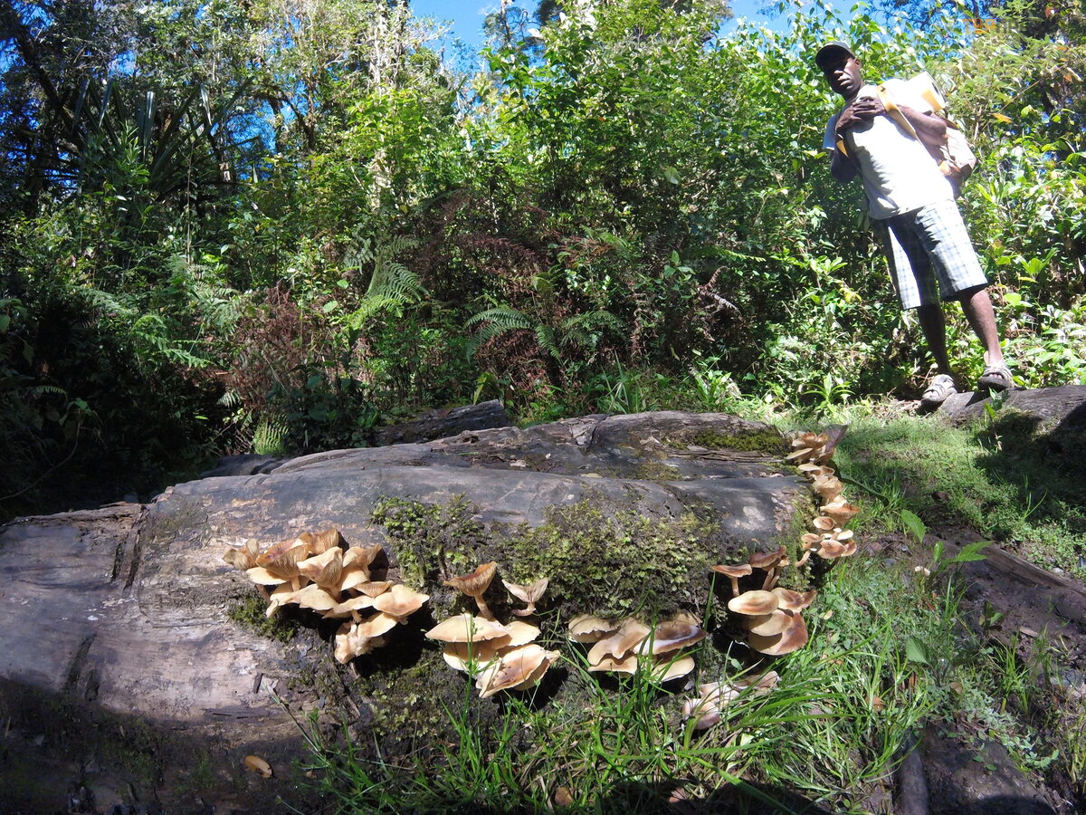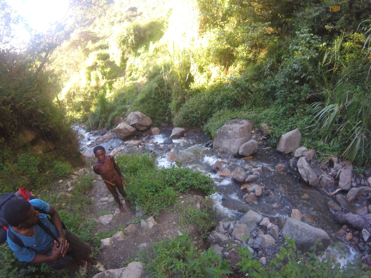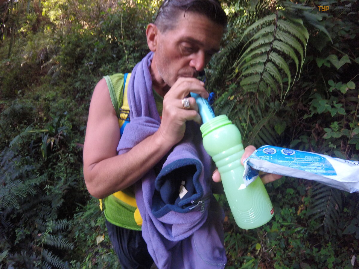 dostał drugi wiatr! Dzisiejsza trasa prowadzi przez dż unglę , nie bę dzie już palą cego sł oń ca. Skoń czył y nam się zapasy wody pitnej, wię c dostaliś my filtry wojskowe i manierki. Wodę moż na czerpać nawet z bagna, co zrobiliś my. Ale filtró w nie dano tragarzom i chociaż byli miejscowi i przyzwyczajeni do swojej wody, rozwinę li biegunkę , uratowaliś my ich naszym wę glem aktywowanym, ale byli bladzi i z 3 tragarzy z naszą grupą opó ź nioną pozostał tylko jeden Raymond . Bardzo czę sto w gó rach na wą skich ś cież kach spotykaliś my miejscową ludnoś ć , któ ra zawsze witał a nas za rę kę albo z badi albo bagi, idą na piechotę do Wameny na bazar po prowiant i z powrotem na gł owę , tymi kozimi ś cież kami nosić cię ż kie torby na zakupy z jedzeniem, z dzieć mi, wodą i garnkami. Oglą danie ich to przyjemnoś ć , chodzisz prawie na pł ucach i oddychasz, w specjalnych butach, w kombinezonach, a oni są boso, a ich nogi są jak pł etwy i ciuchcią ,