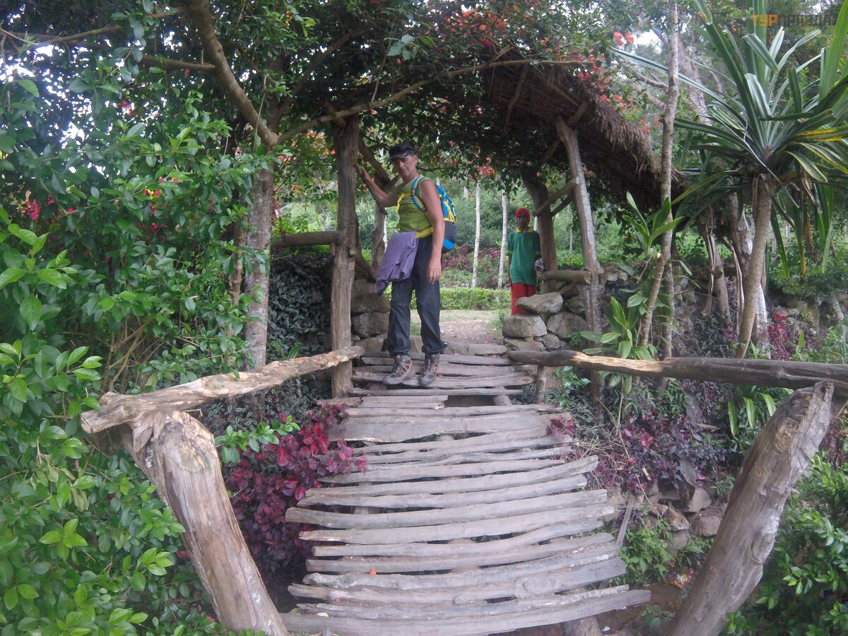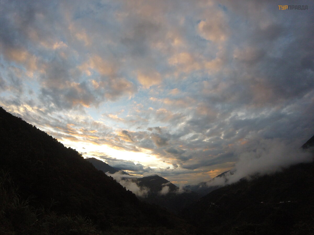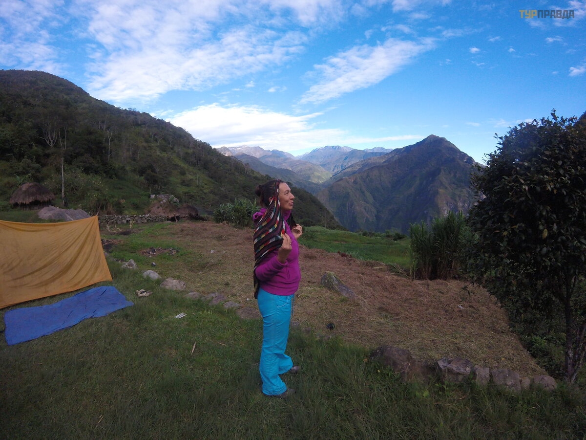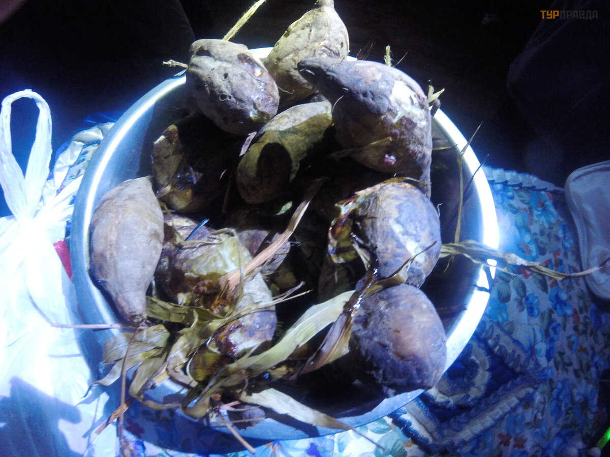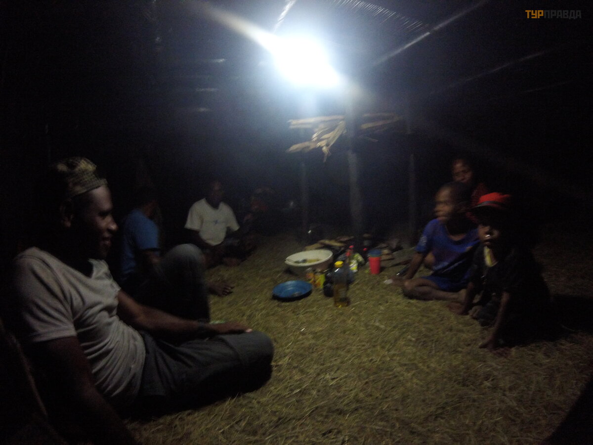 Bardzo szybko robi się ciemno o 18:00, ledwo zdą ż yliś my rozbić namioty. Poszliś my na posił ek do miejscowych we wsi. Kobieta, któ ra nawet nie wie, ile ma lat ugotowany pochrzyn (sł odki ziemniak) i gotowane liś cie tego warzywa na sał atkę , ponieważ mieliś my oliję , só l, duż o sosó w, chleb, a nawet smalec, podobał mi się obiad. Zrobiliś my jej kanapkę z czarnym chlebem, musztardą i smalcem, jadł a, mó wił a pysznie.