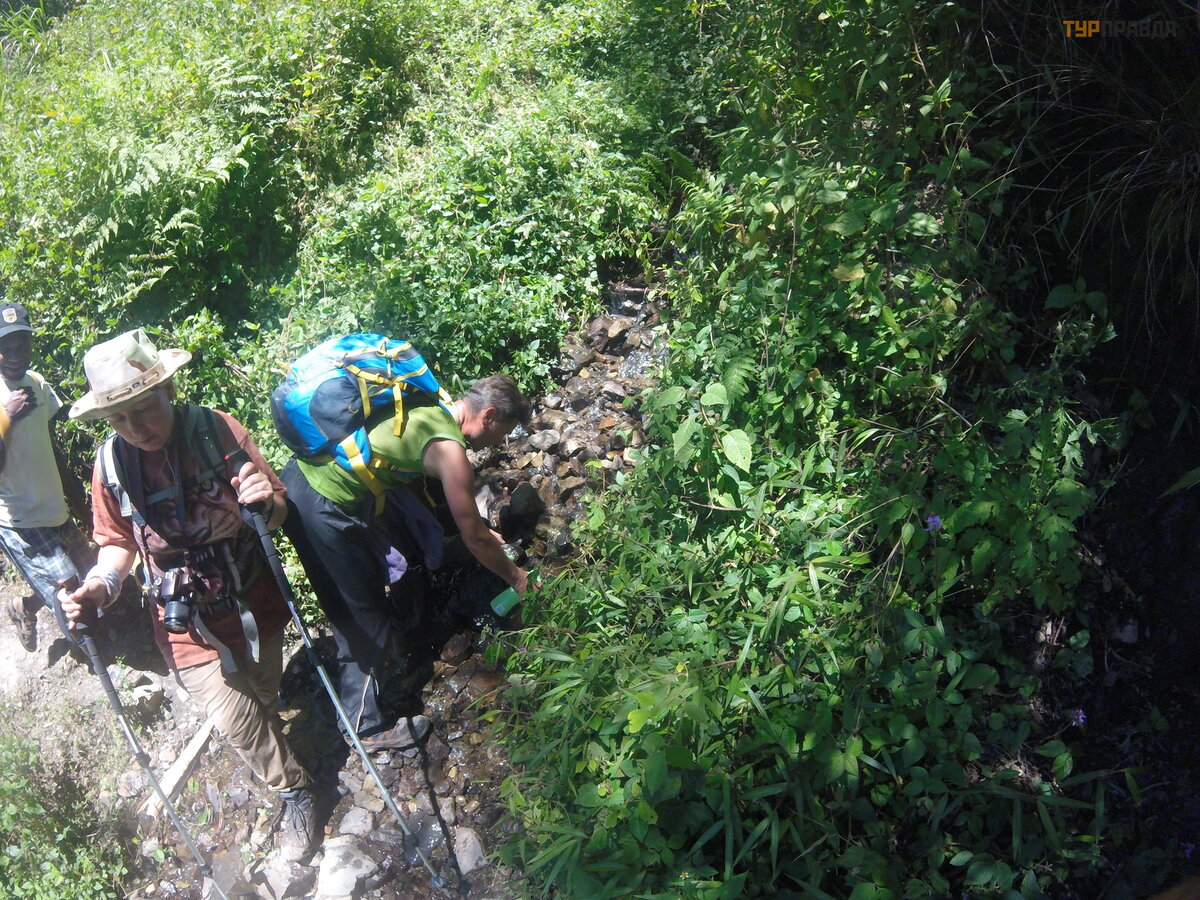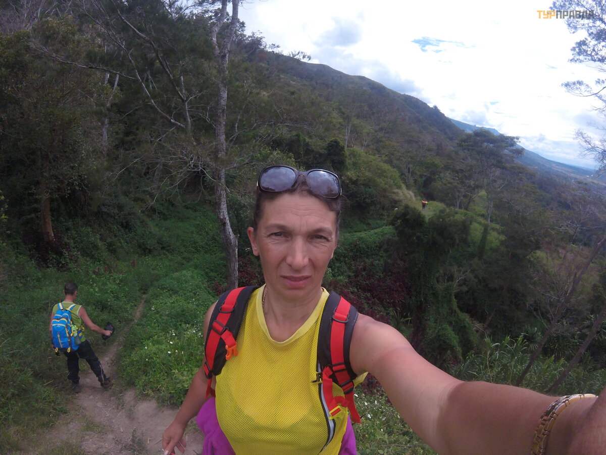 Trudno, sł oń ce pali, wą ska ś cież ka na szczyt wś ró d oszał amiają cych Natura. My troje zostajemy w tyle, mó j mą ż jest przeze mnie, jesteś my cał kowicie zrelaksowani, kiedyś dojedziemy, zwł aszcza nie wiemy gdzie, tragarze są za nami, zamykają c naszą grupę
