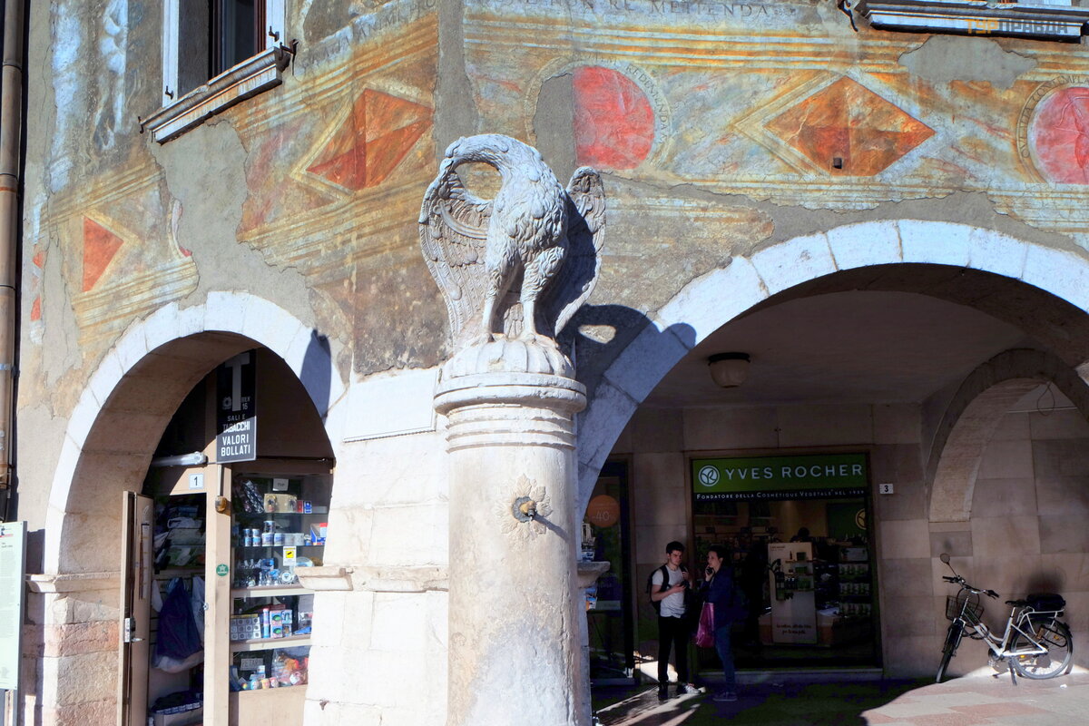 Przy jednym z malowanych domó w Fontanna Orł a (orzeł jest oficjalnym symbolem Trydentu) wznosi się niepozornie: