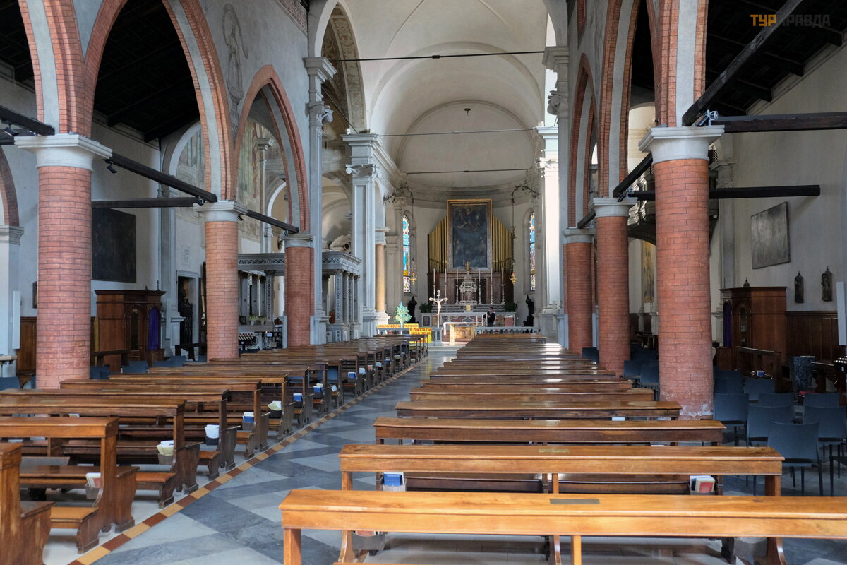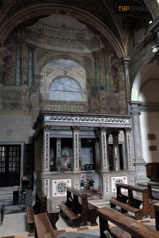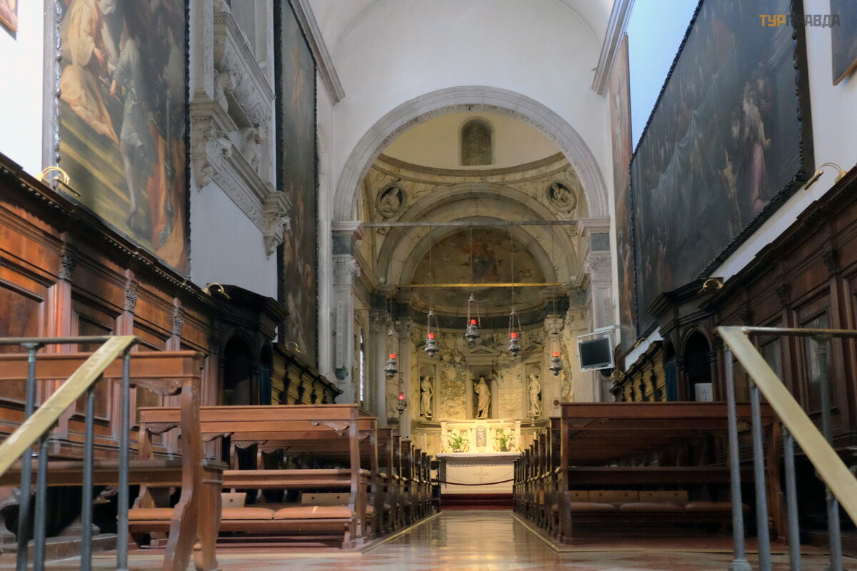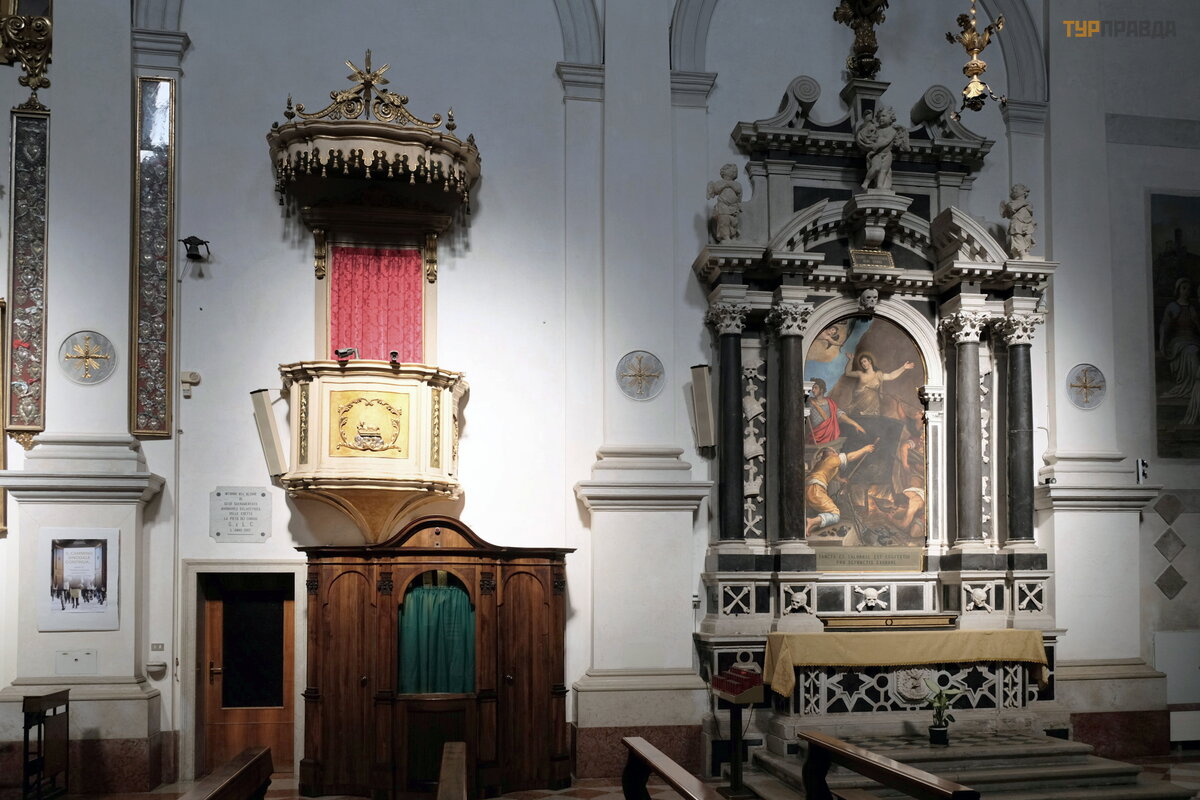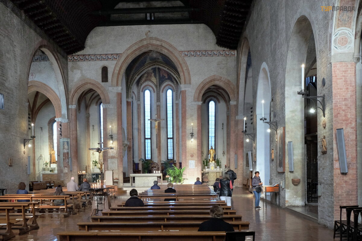 Wewną trz moż na zobaczyć wiele ró ż nych dekoracji, takich jak drewniany sufit, kamienne i ceglane kolumny i ł uki, a takż e kolorową podł ogę wył oż oną kafelkami. Wewną trz spoczywają dzieci wielkich poetó w - Francesca Petrarch, któ ra zmarł a w Treviso w 1384 roku, oraz syn wielkiego Dantego - Pietro Alighieri, któ ry sam był poetą .