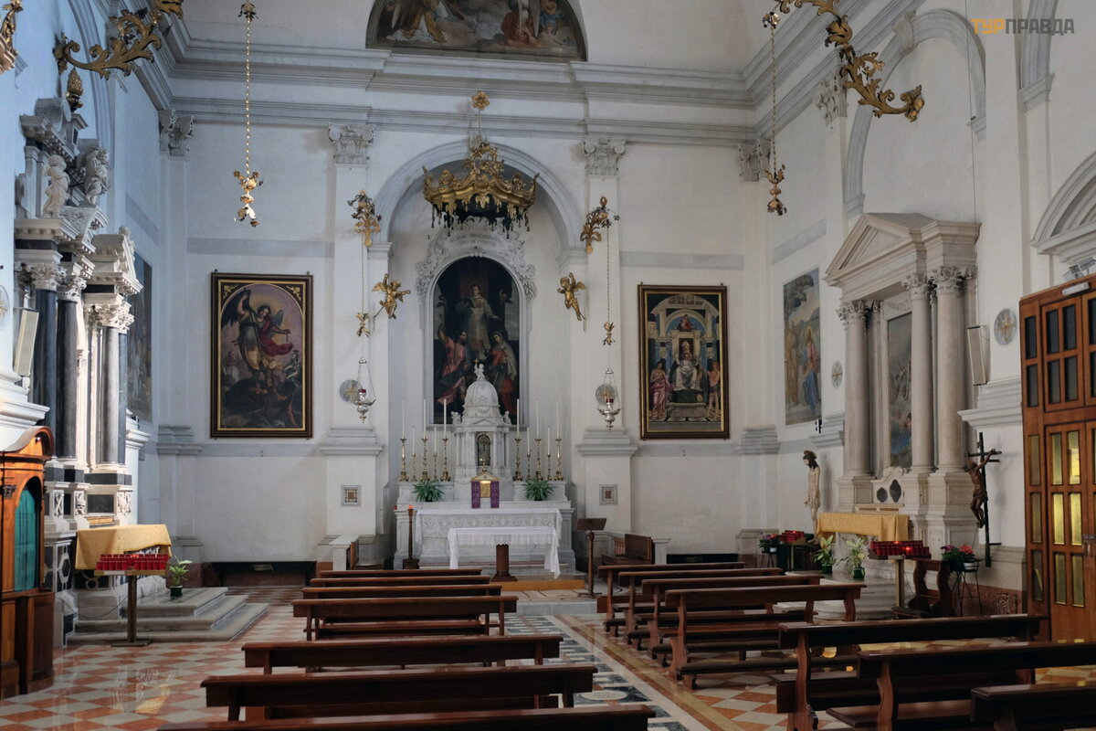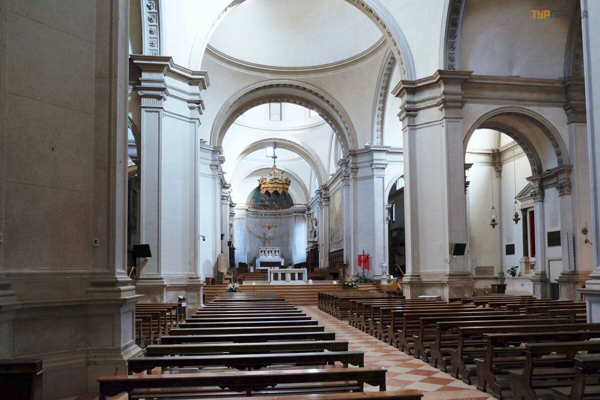Wnę trze wykonane w formie jednej wspó lnej sali – nawy. Tutaj moż na zobaczyć oł tarze ś w. Michał a i ś w. Leonarda, wykonane przez artystę Ludovica Pozzoserata.