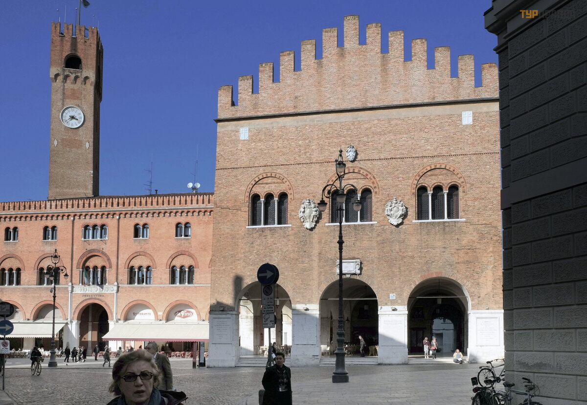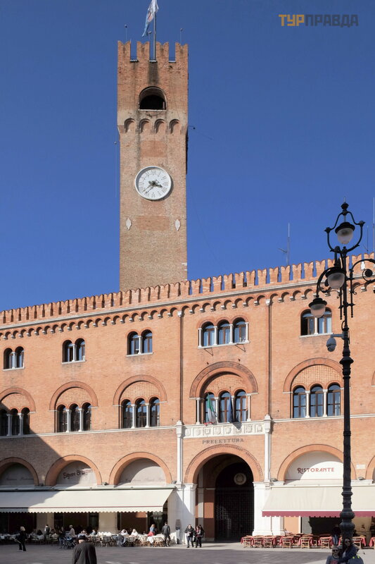 Pał ac Prefektury (Prefettura di Treviso) z bogato zdobioną fasadą i ogromną dzwonnicą zasł uguje na szczegó lną uwagę :
