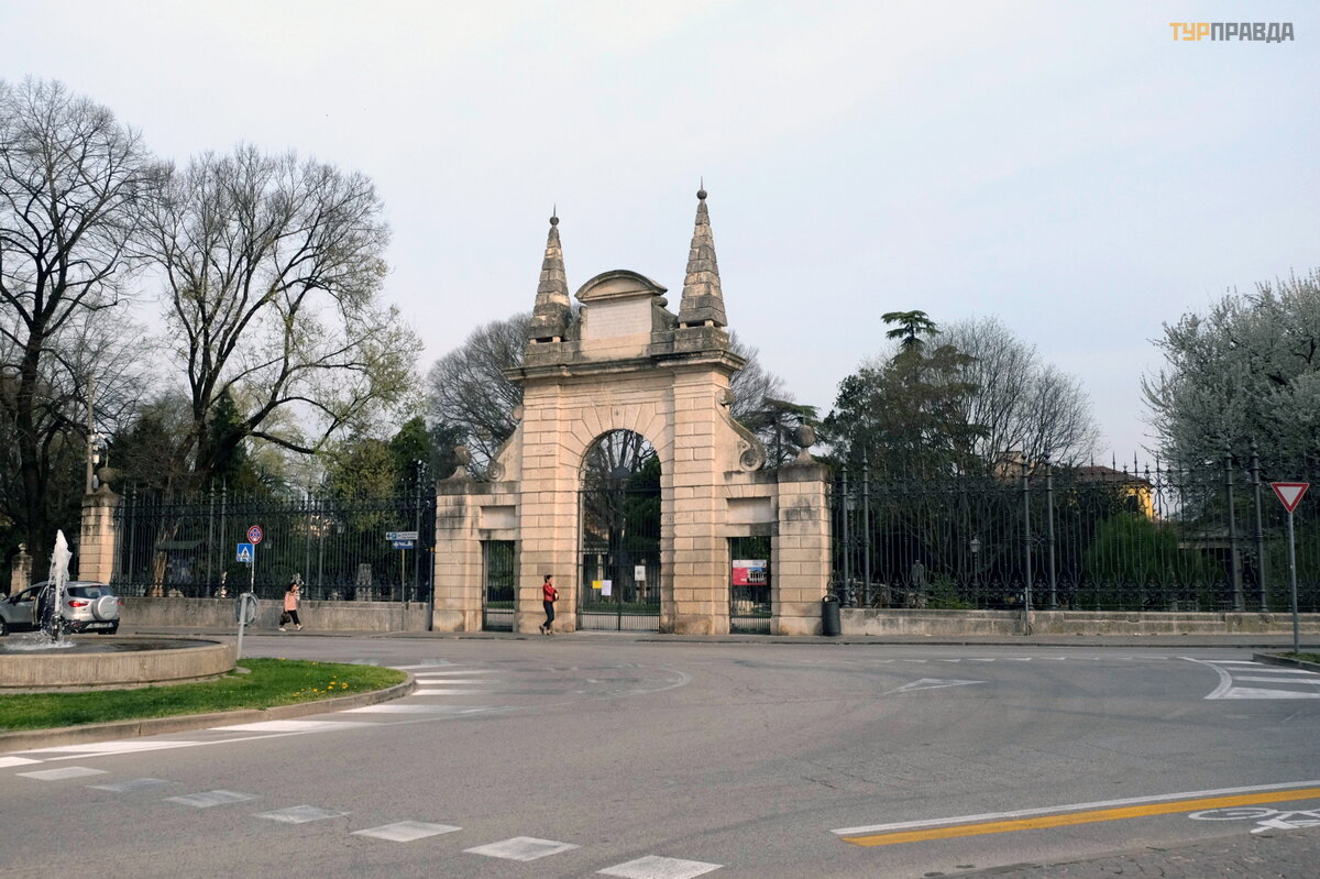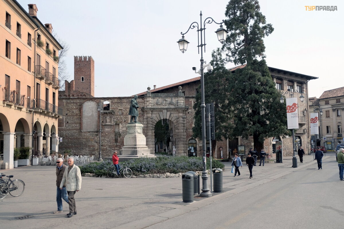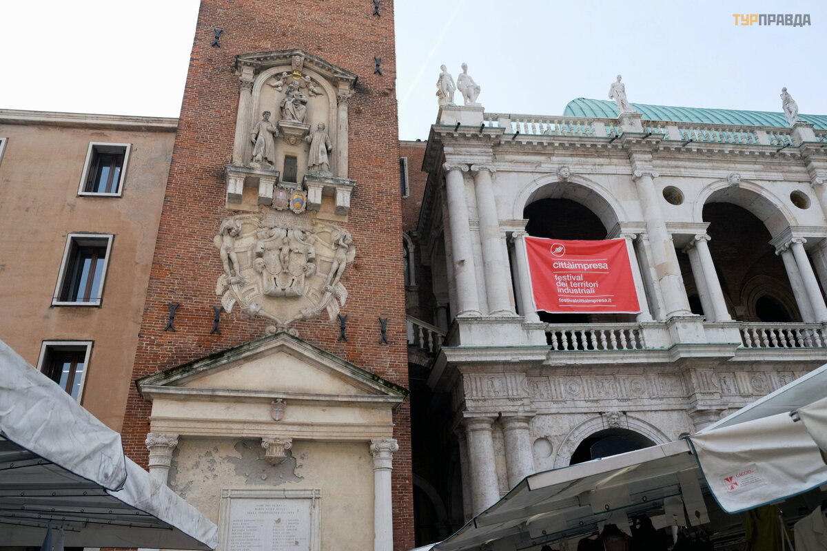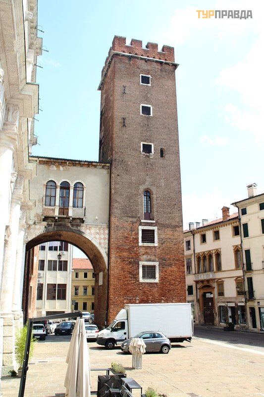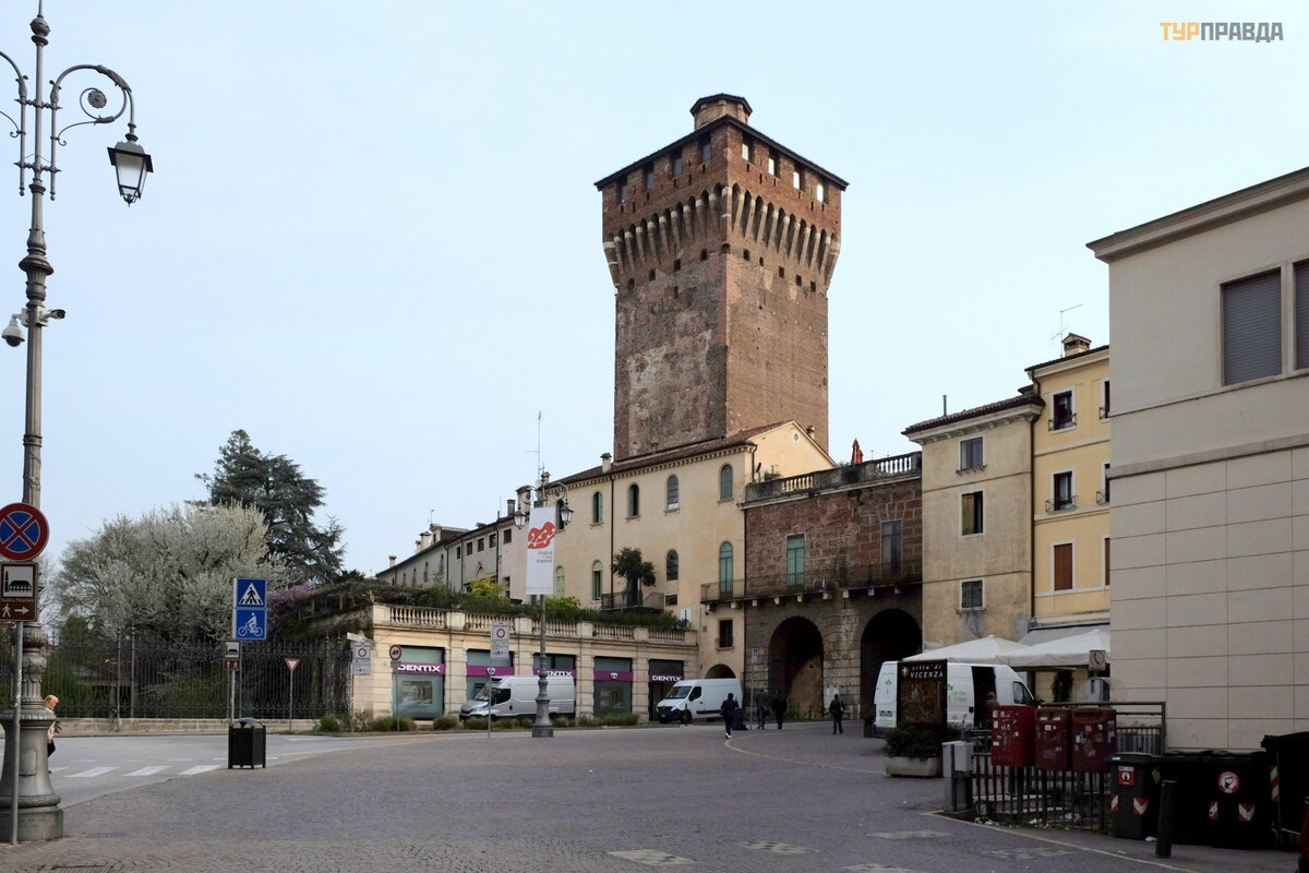 Przybyliś my do Vicenzy o godzinie 9 rano. Od dworca kolejowego Vicenza do zabytkó w miasta droga prowadzi przez bramę Castello - Torrione di Porta Castello (XI-XV wiek). Bramy (nie tylko te, ale jeszcze kilka w ró ż nych czę ś ciach miasta) pozostał y oczywiś cie z miejskich struktur obronnych. I ta wież a jest jedyną pozostał oś cią zamku, któ ra istniał a tu przed rozpoczę ciem budowy muró w zamkowych. Stą d nazwa.