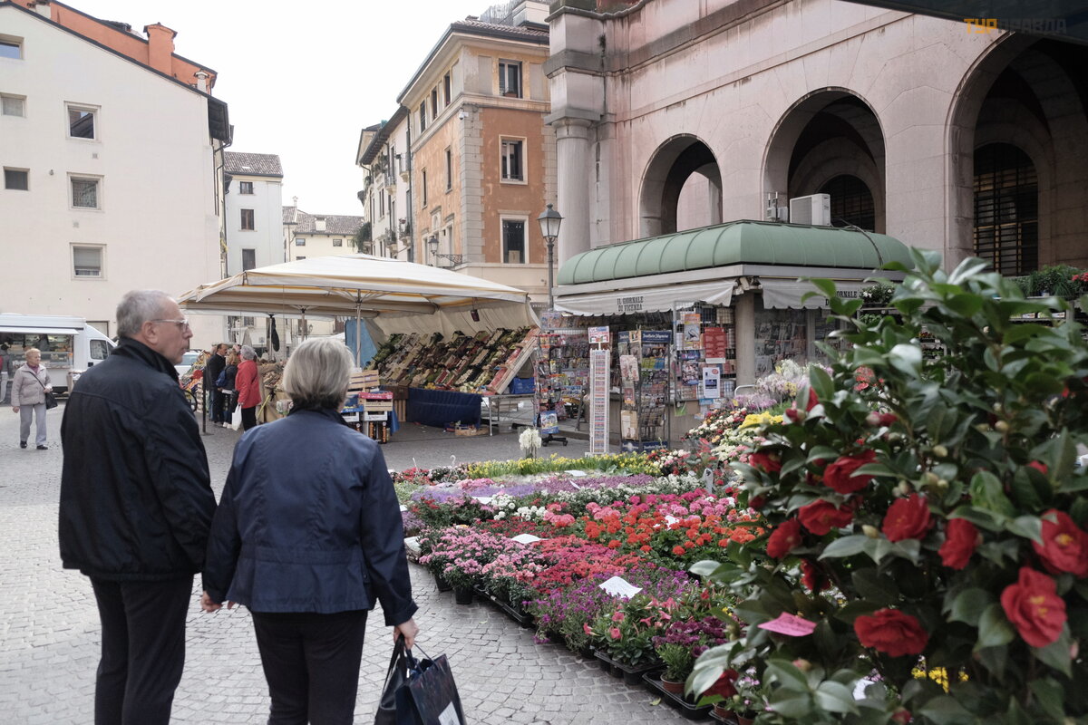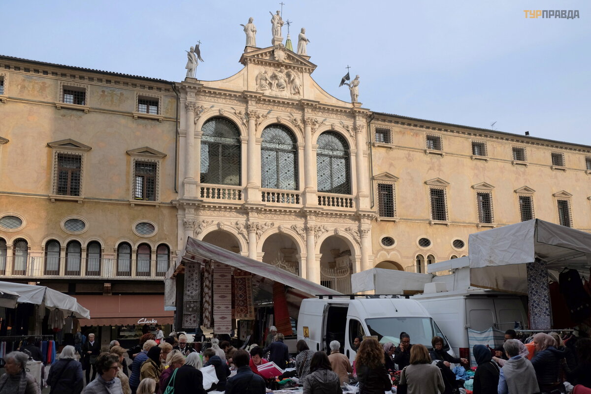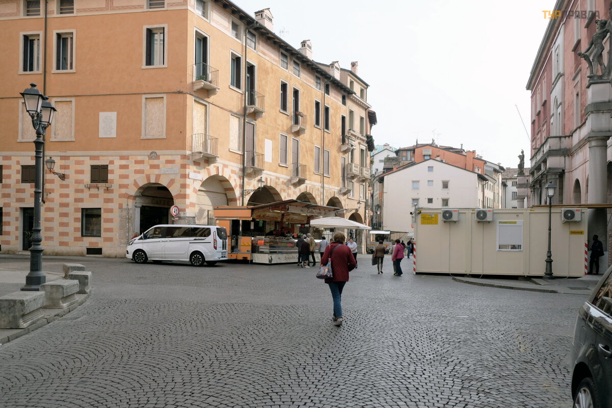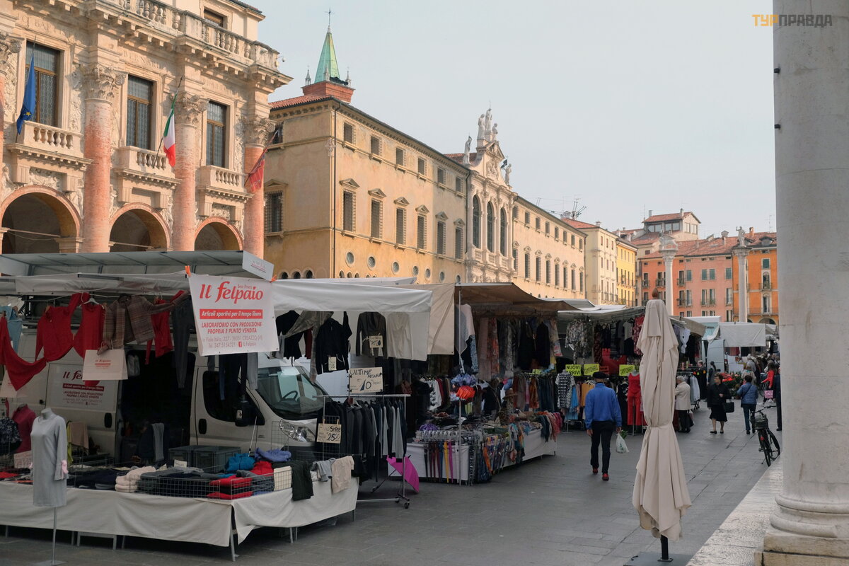 Niestety dla mnie i ku radoś ci mojej ż ony, na gł ó wnym placu miasta - Piazza dei Signori - był o wielu kupcó w, ponieważ był to wyjś ciowy targ odzież owy.