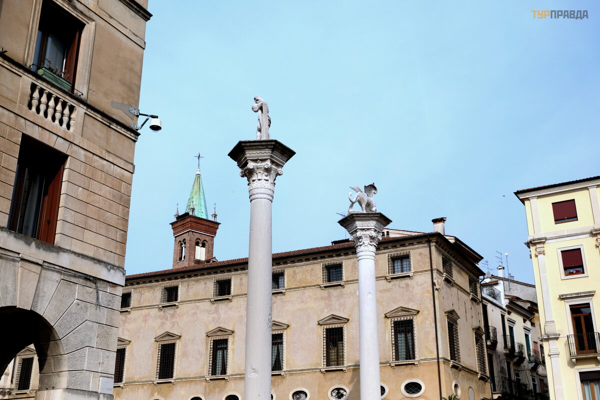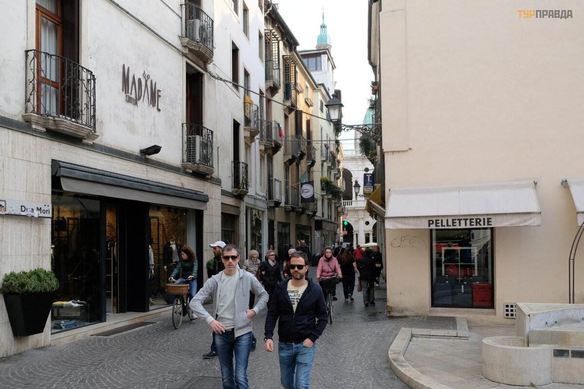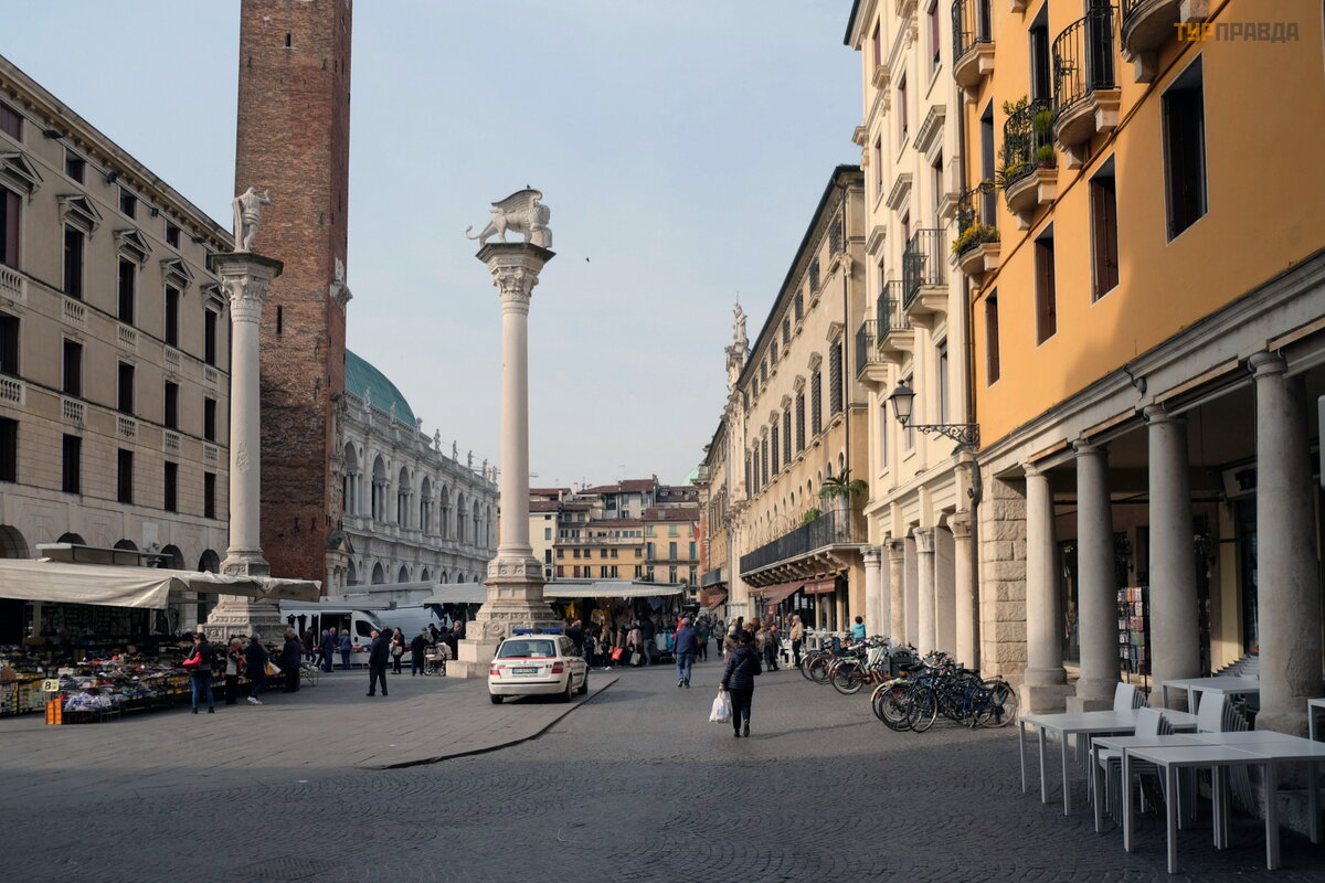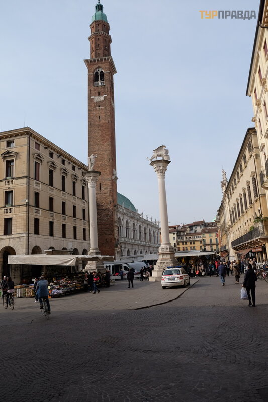 Niestety dla mnie i ku radoś ci mojej ż ony, na gł ó wnym placu miasta - Piazza dei Signori - był o wielu kupcó w, ponieważ był to wyjś ciowy targ odzież owy.