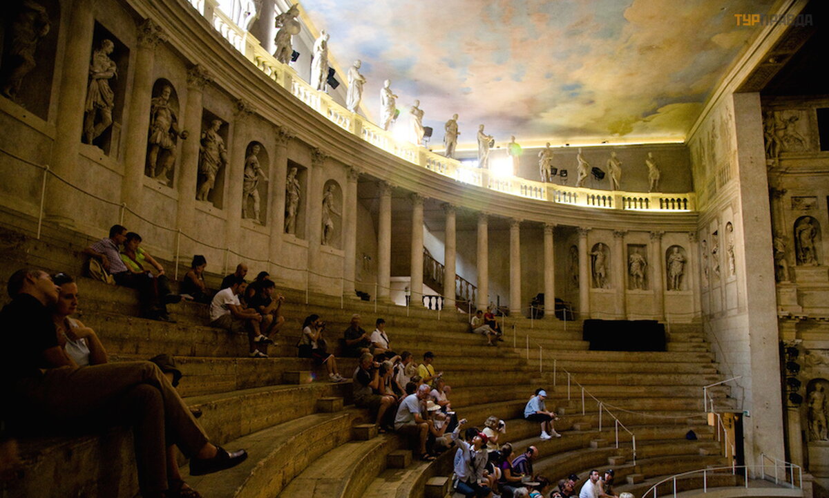 Teatr stoi na miejscu staroż ytnej fortecy Palazzo del Territorio. Teatr powstał w latach 1580-1585. i stał się ostatnim arcydzieł em Palladio. Prawdą jest, ż e syn Palladia, Silla, koń czył już teatr, a potem architekt Vincenzo Scamozzi.