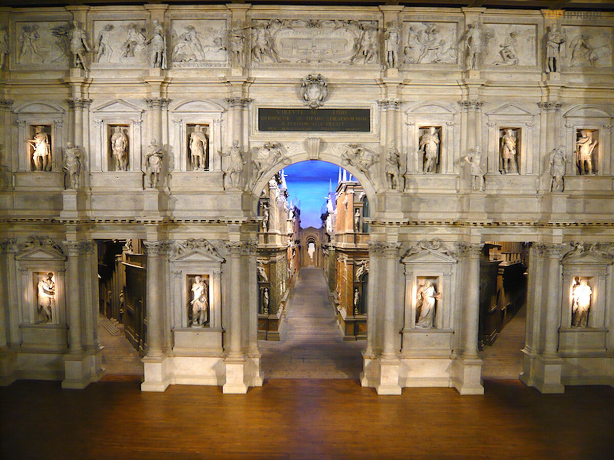 Stworzone na pierwszy wystę p Kró la Edypa w 1585 roku, pozostają niezmienione do dziś . Ś redniowieczne ulice (miasto Teb) cią gną ce się w oddali są widoczne przez centralny ł uk i otwory. Aż trudno uwierzyć , ż e dł ugoś ć gł ó wnej ulicy wynosi tylko 12 m. Iluzję dł ugoś ci tworzą wznoszą cy się „chodnik”, opadają ce „niebo” i kurczą ce się „budynki”.