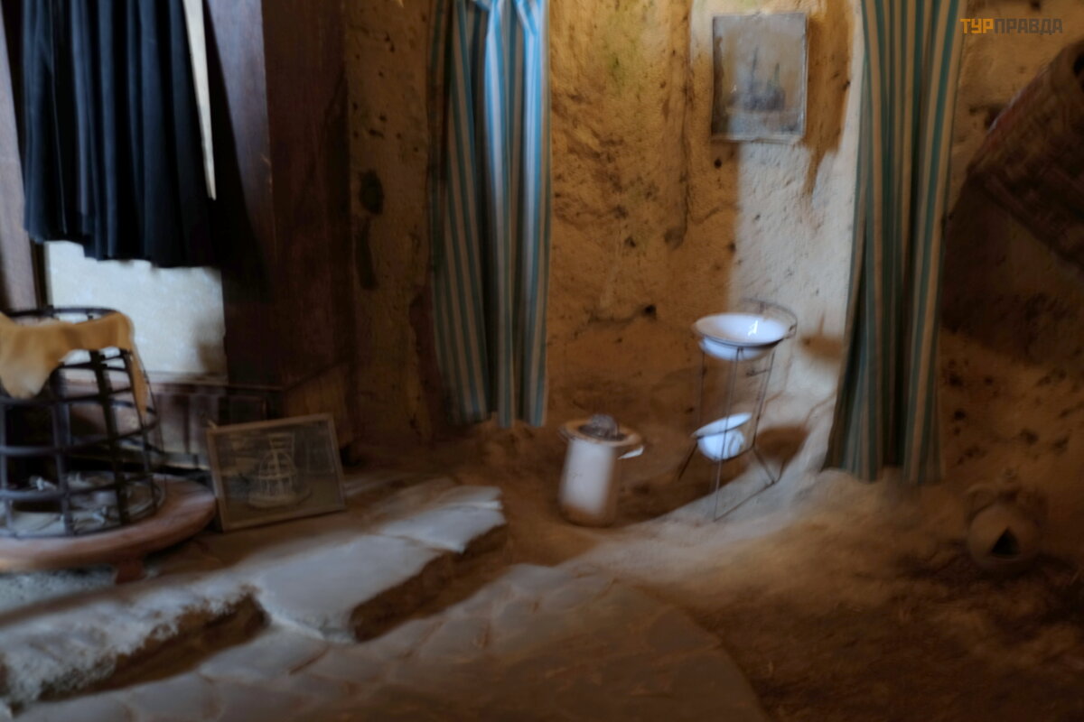 Ś wiatł o wpadał o do domu przez mał e okno na gó rze. Temperatura w domach był a prawie stał a - 15 stopni, tuf, w któ rym urzą dzono mieszkania, dział ał jako kontrola klimatu.