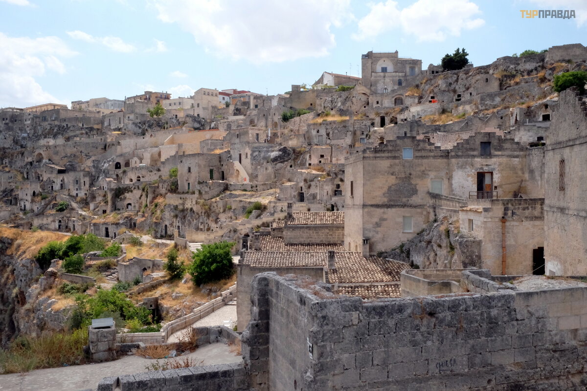 Po latach miasto został o otoczone murem ochronnym, a liczne groty i masywy skalne zaczę to wykorzystywać do budowy wiejskich mieszkań , wię c ze szczytu zaczę ł y schodzić kwartał y, któ re popularnie nazywano „sassi”. Ta nazwa to formacja od sł owa „sasso” - kamień , skał a.