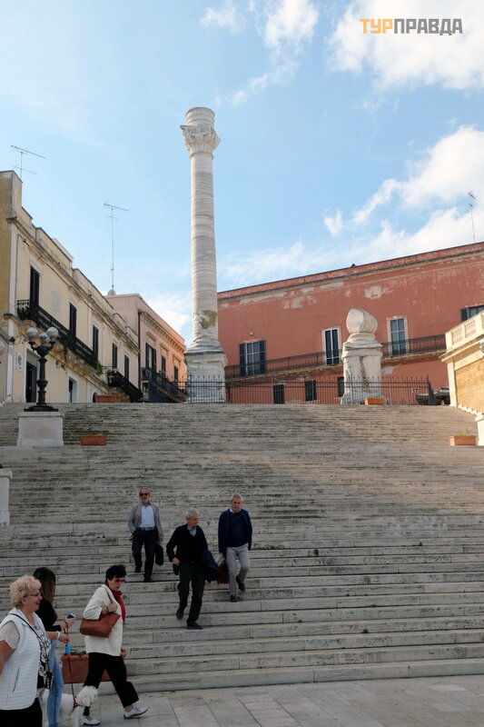 na ich szczycie znajdują się staroż ytne rzymskie kolumny - symbol miasta, któ re od dawna sł uż y jako przewodnik dla ż eglarzy. W staroż ytnoś ci oznaczał y one koniec drogi Appijskiej. Jedna z kolumn pę kł a podczas trzę sienia ziemi w 1528 roku, a wiek pó ź niej jej fragmenty ofiarowano są siedniemu Lecce, gdzie zbudowano kolumnę ku czci ś w. Oroncjusza.
