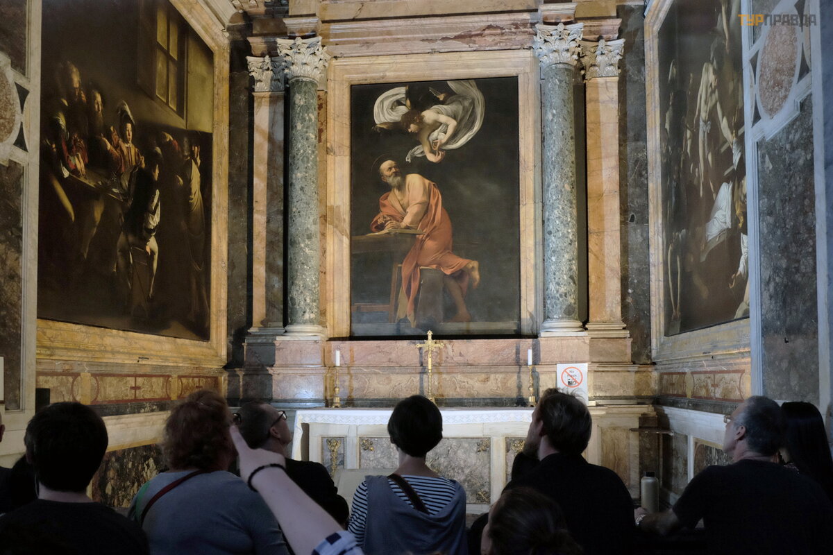 Ale gł ó wnym skarbem koś cioł a, do któ rego aspirują wszyscy turyś ci, jest kaplica Contarellich z trzema dzieł ami wielkiego artysty Caravaggia, rodzaj tryptyku poś wię conego Apostoł owi Mateuszowi („Powoł anie”, „Mę czeń stwo” i „ Ś w. Mateusz i Anioł "). Kaplica jest doś ć wą ska, wię c dwa obrazy widać pod niewygodnym ką tem.
