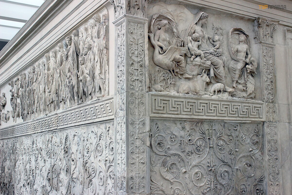 Pod tym szklanym pawilonem znanym Wł ochom miejscem jest Oł tarz Pokoju (Ara Pacis Augustae), utworzony w 13 rpne. mi. wraz z Koloseum i Panteonem jest jednym z wybitnych zabytkó w antycznych. Został zbudowany na cześ ć zwycię stw cesarza Augusta, któ re oznaczał y koniec wojny domowej. W XVI wieku Oł tarz został zalany przez wylaną rzekę i przez kilka stuleci pozostawał pod wodą i warstwą bł ota. Renowację oł tarza rozpoczę to zgodnie z planem Mussoliniego, nastę pnie po raz pierwszy zastosowano zamraż anie gleby za pomocą dwutlenku wę gla.