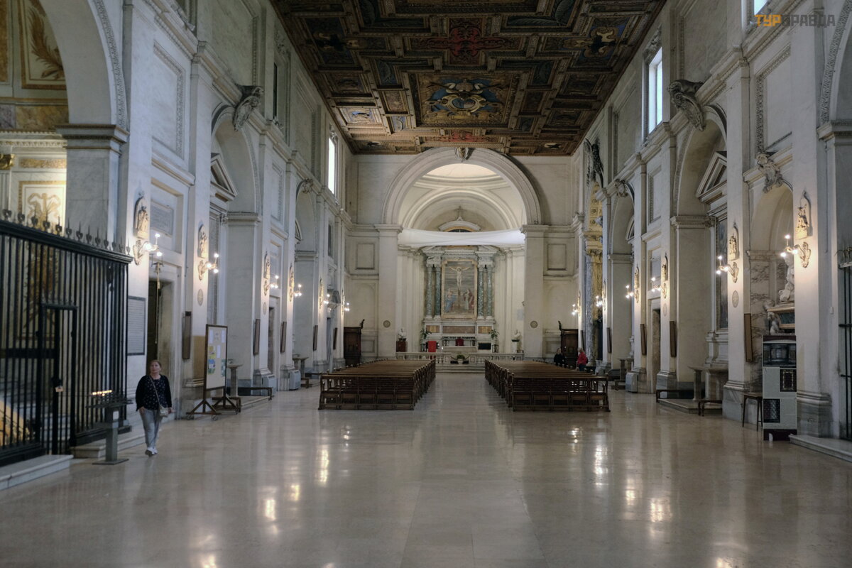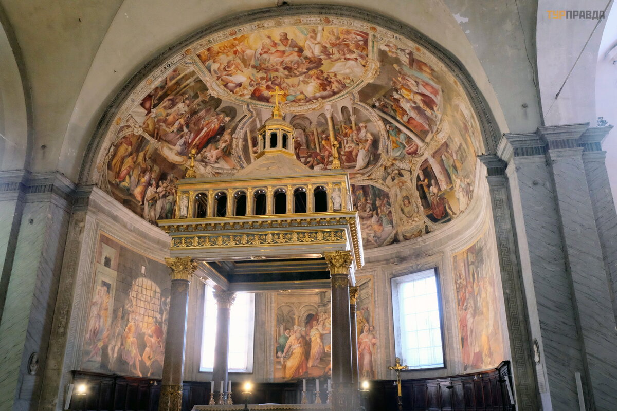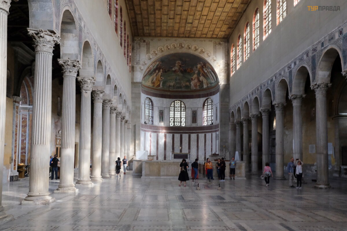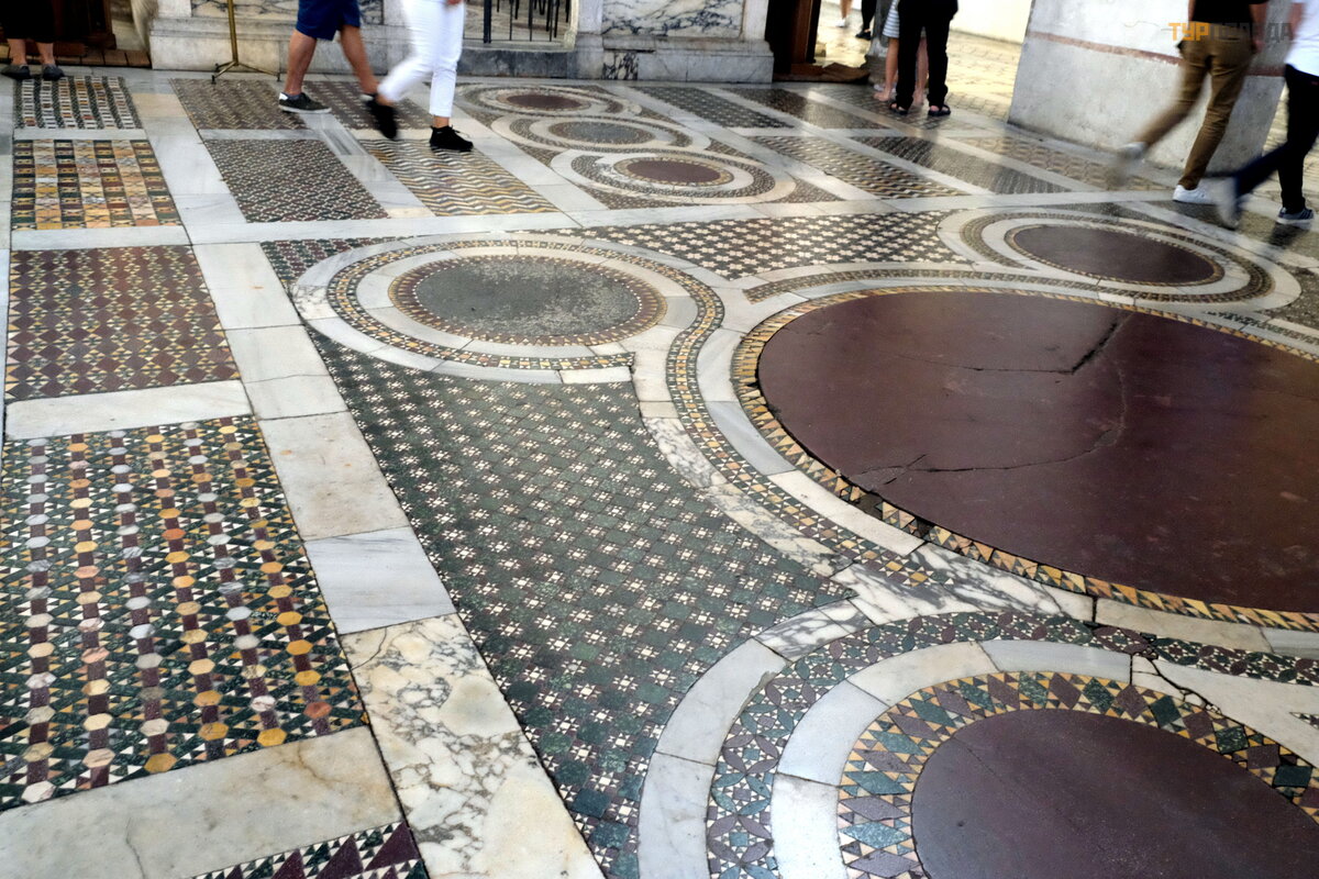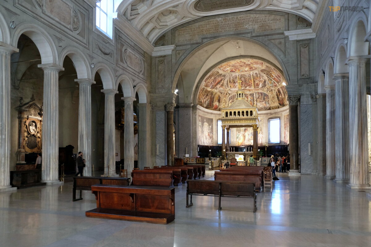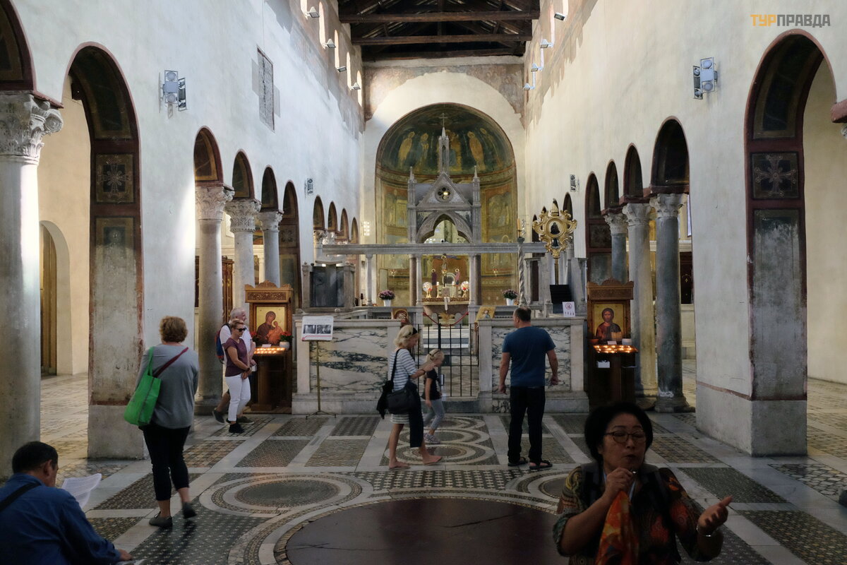 Koś ció ł sł ynie ze wspaniał ej XII-wiecznej mozaikowej podł ogi cosmatesco. Kolumny ze staroż ytnych ś wią tyń .