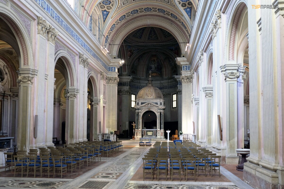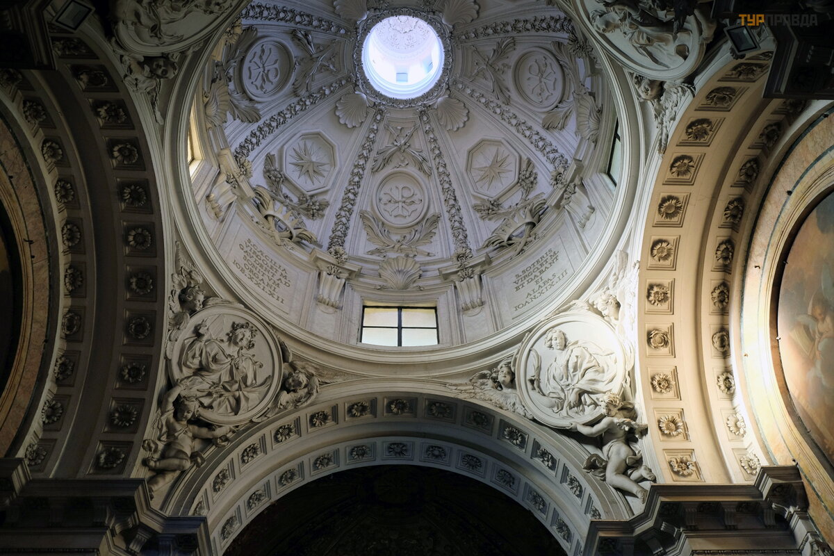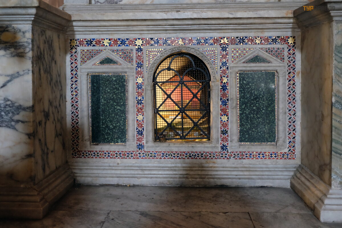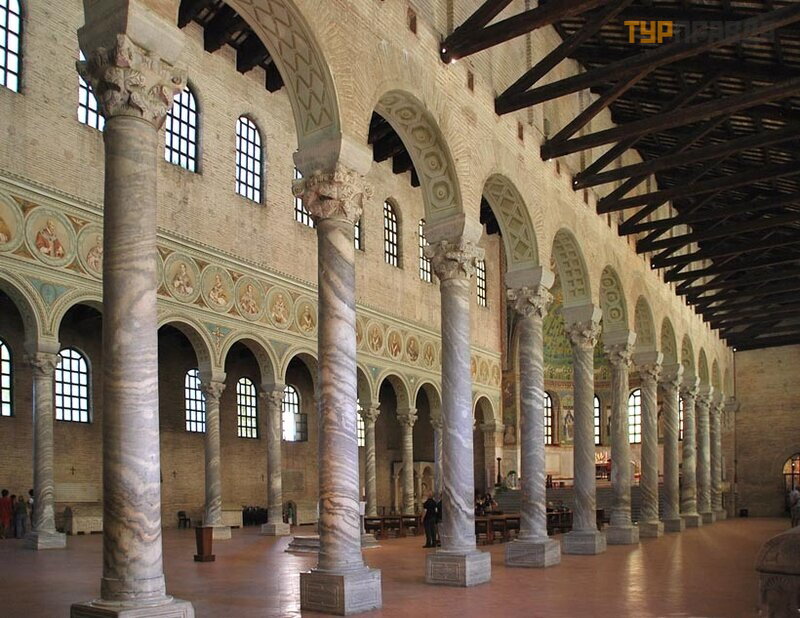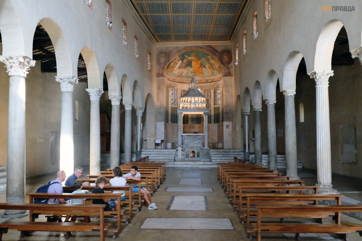 Okna wykonane nie ze szkł a, ale z selenitu, dzię ki czemu nawet w najjaś niejsze sł oneczne dni w bazylice kró luje przytł umione ś wiatł o. Koś ció ł ma 24 kolumny ze staroż ytnej ś wią tyni Juno Regina, któ ra pojawił a się już w 400 rpne.