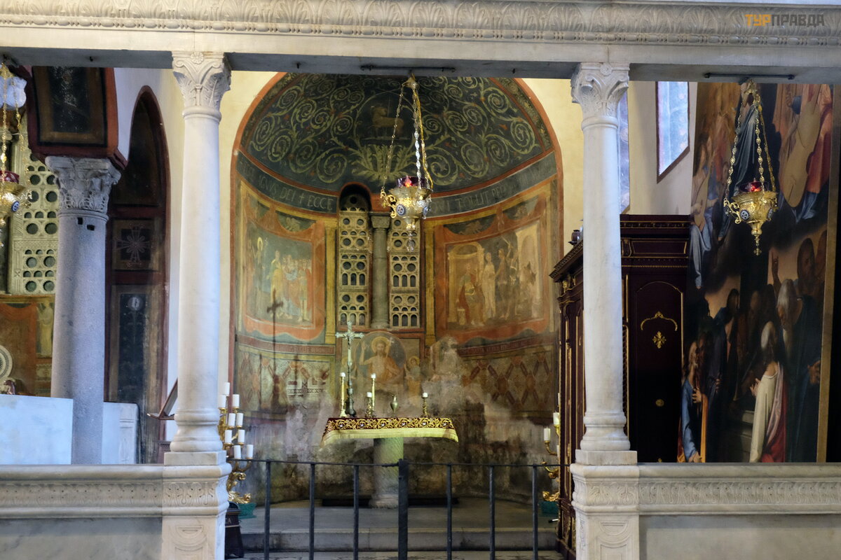 odnoszą ce się do odcinka „Domine quo vadis? ”, opisane w Biblii i wydarzył o się w tych miejscach. Przechowywana jest tu ró wnież jedna ze strzał , któ re trafił y ś w. Sebastiana oraz kolumna, do któ rej był przywią zany podczas egzekucji.