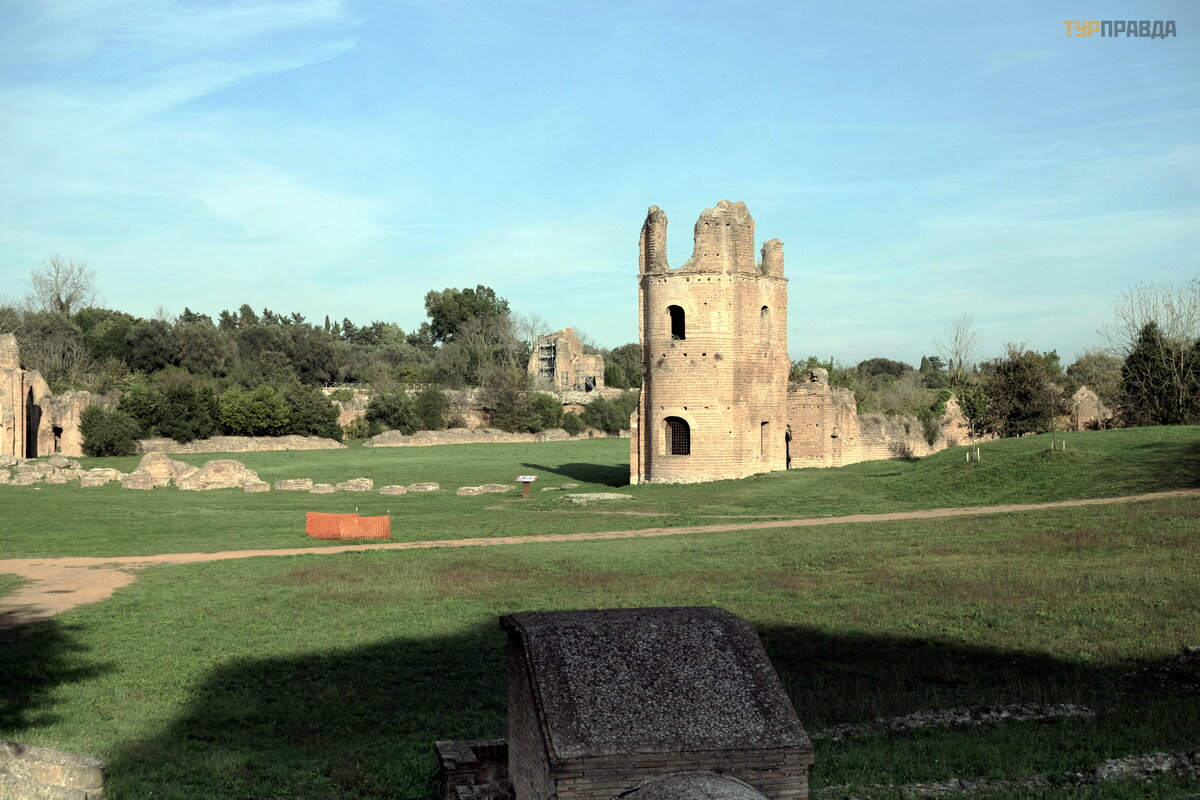 Villa di Massenzio - a raczej ruiny budynkó w z czerwonej cegł y na trawiastym polu. Pierwsze budynki na tym terenie pojawił y się w I wieku p. n. e. pne mi.