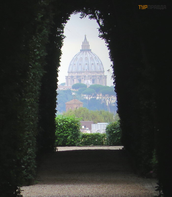 Wedł ug projektu Piranesiego, któ ry zbudował rezydencję , wykonano specjalny otwó r, z któ rego widać trzy stany: Zakon Maltań ski (któ ry jest wł aś cicielem rezydencji Zakonu), Watykan (Bazylika ś w. Piotra ) i Wł och (co obejmuje wszystko pomię dzy).