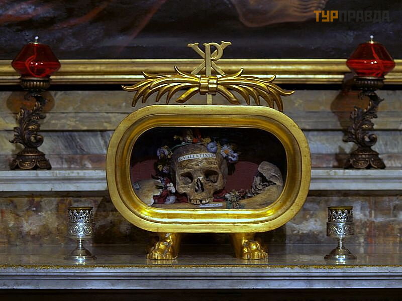 Gł ó wną relikwią koś cioł a jest czaszka ś w. Walentynki ozdobione kwiatami. Ten sam ś wię ty, na któ rego cześ ć co roku 14 lutego odbywa się ś wię to wszystkich kochankó w.
