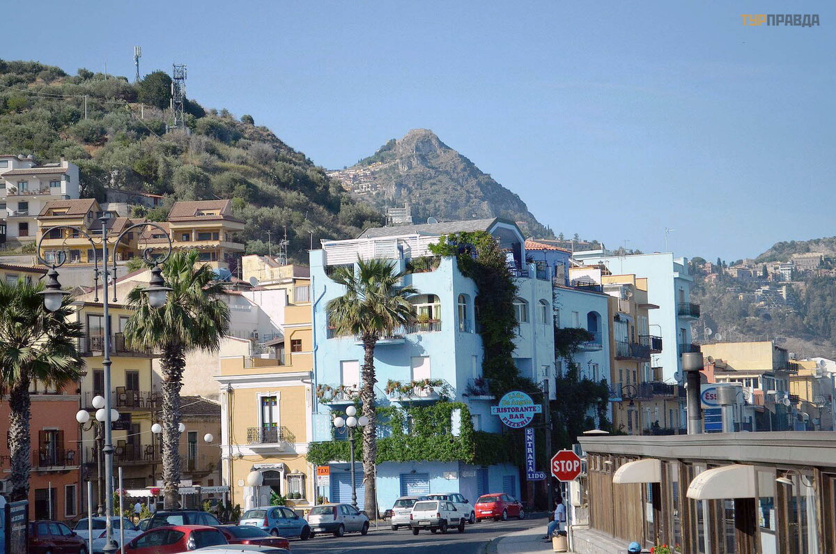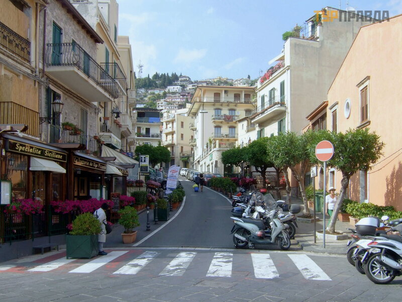 Ulica z kawiarnią prowadzi do hotelu, w któ rym Pozner i Urgant zostali nakrę ceni podczas programu telewizyjnego o Sycylii.