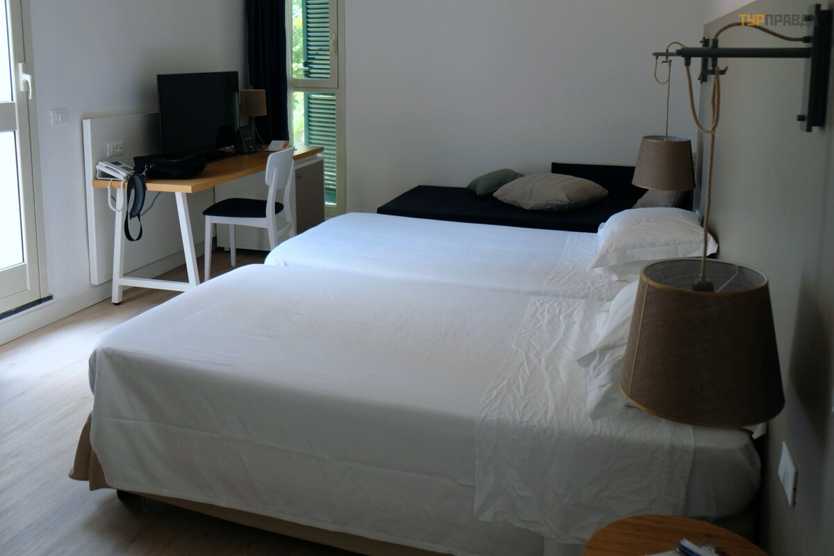 Wystró j w pokoju jest standardowy, bardzo wygodne jest, ż e wraz z klimatyzatorem jest też wentylator. Niedaleko hotelu rzeka wpada do morza, ze wzglę du na to okno nie poleca się otwierać w nocy z powodu komaró w. Etna jest dobrze widoczna z loggii w naszym pokoju.