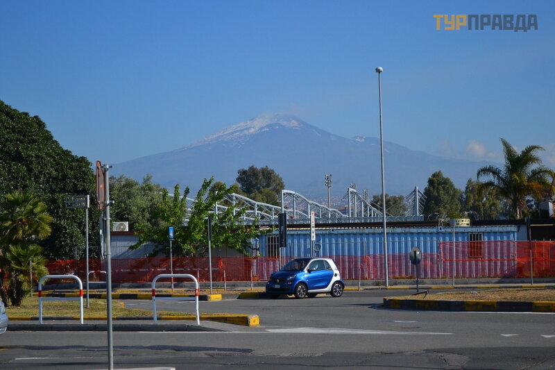 Lotnisko przylotu – Katania, z niego do miasta Giardini Naxos jedzie się okoł o godziny. Pierwszą rzeczą , któ rą zobaczyliś my na Sycylii był a Etna. W regionie Katanii po prostu wznosi się ponad horyzont. Sycylijczycy z szacunkiem nazywają Etnę - „gó rą ”.
