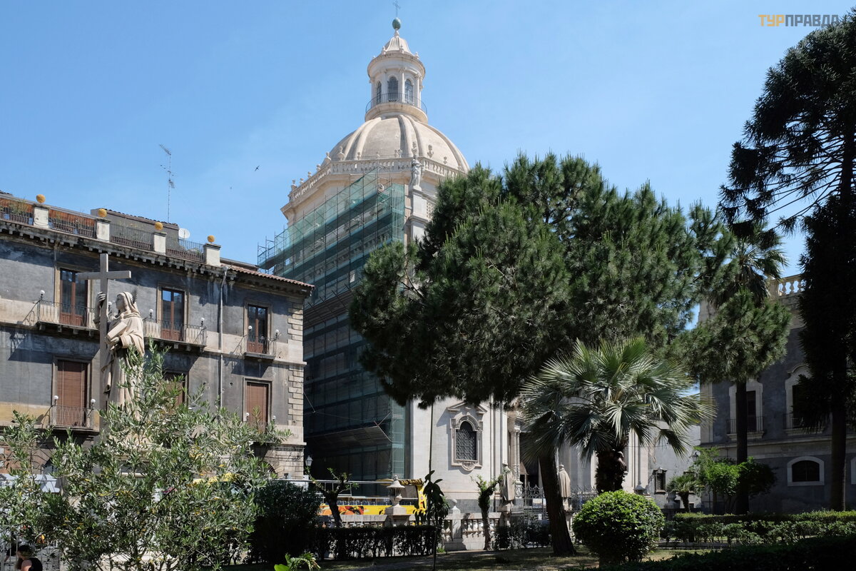 Ten ogromny budynek to koś ció ł ś w. Mikoł aja (Chiesa di San Nicolò l'Arena), najwię kszy koś ció ł na Sycylii. Koś ció ł był wielokrotnie przebudowywany, ale nigdy nie został ukoń czony z powodu braku funduszy.