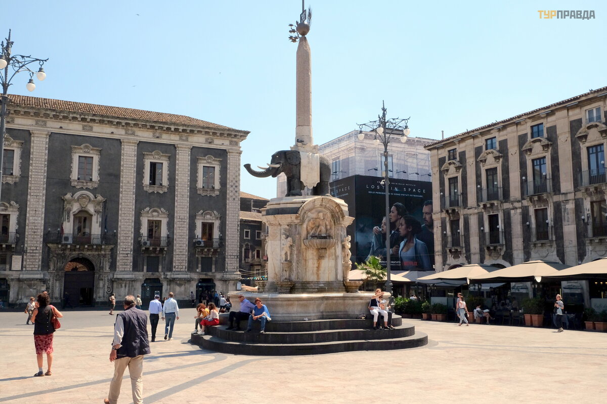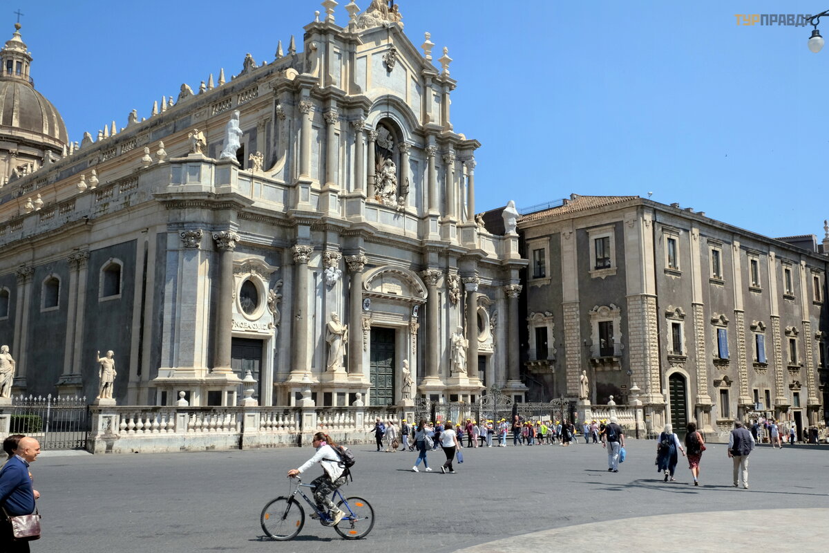 Poś rodku placu znajduje się Katedra Katanii (1739), Katedra ś w. Agaty (Catedrale di Sant'Agata), patronki miasta, Sycylii i Malty. Ś wią tynia został a wzniesiona pod koniec XII wieku na ruinach zniszczonej przez trzę sienie ziemi rzymskiej budowli. Wł aś nie podczas naboż eń stwa po katastrofalnym trzę sieniu ziemi w 1693 roku pod wł asnymi gruzami pochowano 7000 modlą cych się obywateli. Był kilkakrotnie przebudowywany, dzisiejsze fasady i wnę trza katedry dekoruje Vaccarini w stylu barokowym.