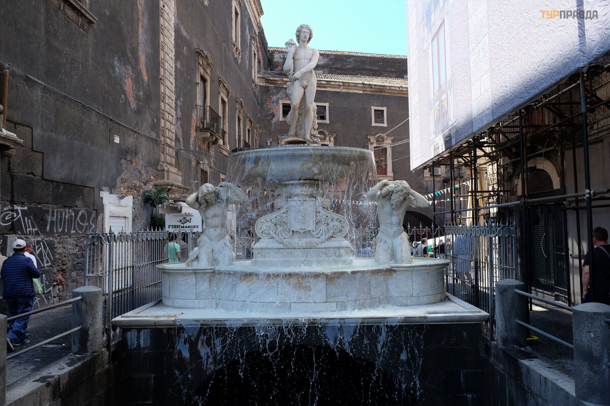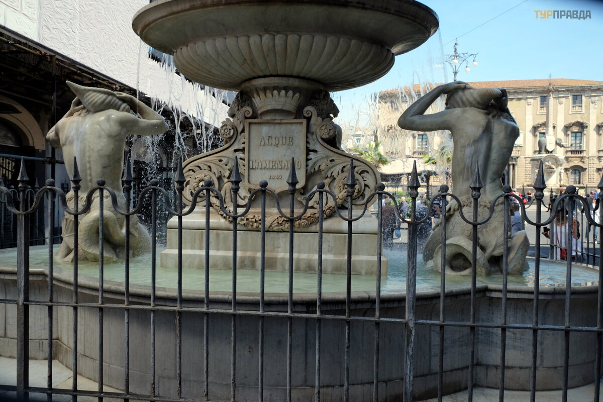 Na skraju Piazza Duomo znajduje się kolejna fontanna Amenano (1867). Centralna rzeź ba fontanny przedstawia boga rzeki Amenano (obecnie rzeka Amenano pł ynie na gł ę bokoś ci dwó ch metró w pod ziemią ). Chł odna woda tej rzeki tryska z fontanny na Placu Katedralnym w pobliż u pomnika ze sł oniem. Mieszkań cy Katanii nazywają ją fontana dell'acqua a linzolu – „wodna w formie prześ cieradł a”.