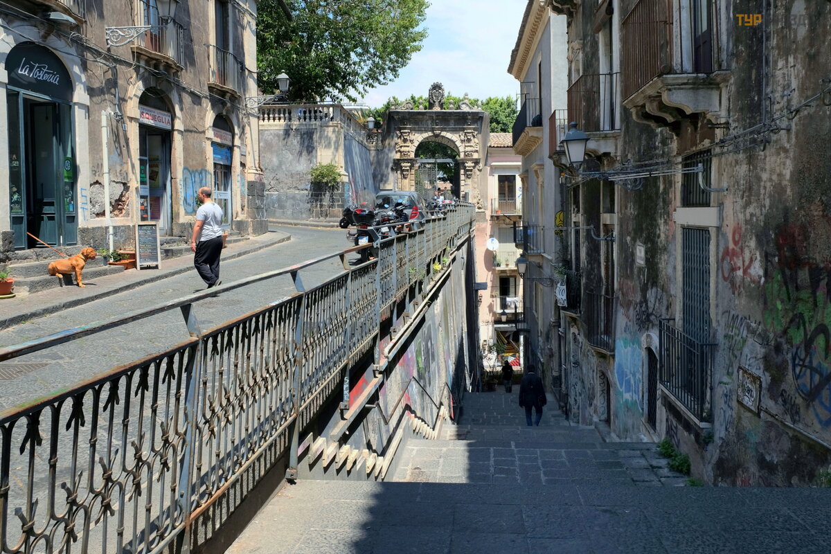 Przez tę bramę moż na przejś ć pod torami kolejowymi, przez przytulny plac do morza i Castello Ursino: