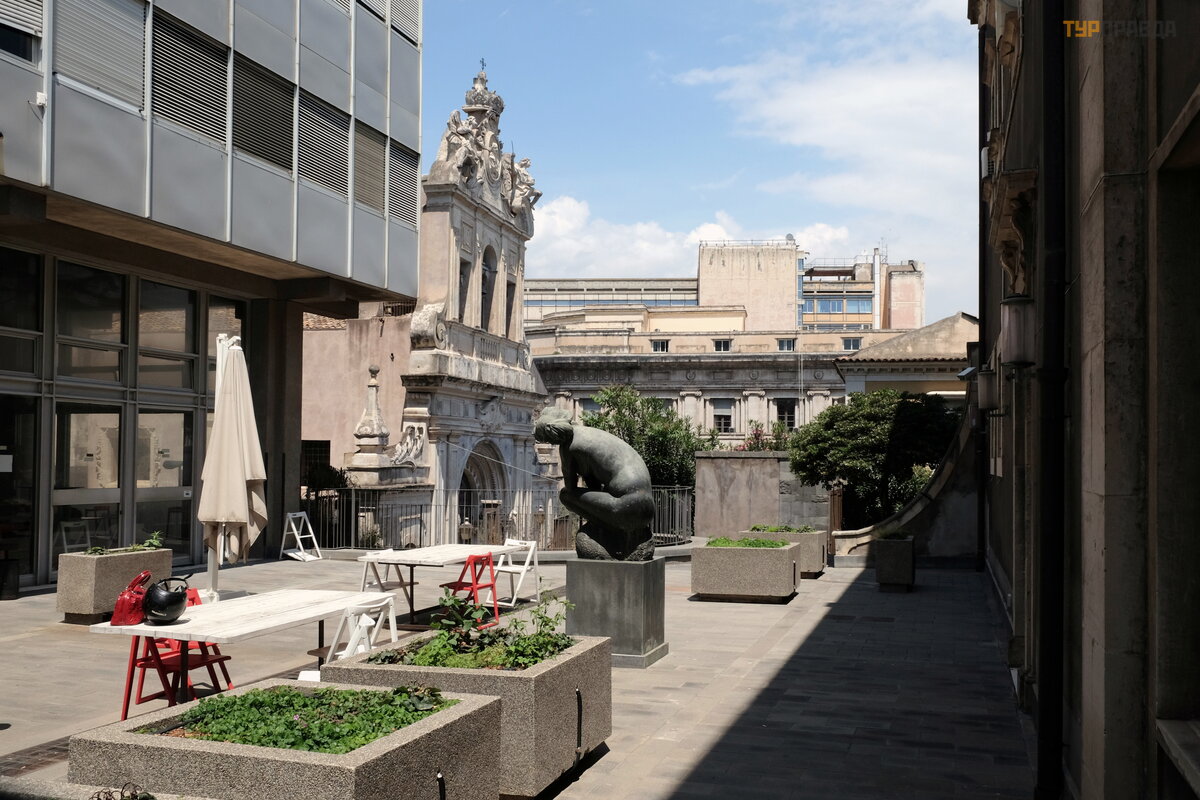 Chodź my na Piazza Universita, któ ry został zaprojektowany przez Vaccarini, z Palazzo dell Universita i Palazzo San Giuliano. University of Catania to pierwszy uniwersytet na Sycylii, zał oż ony w 1434 roku.