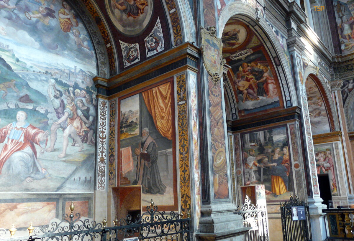 Pobudzony ciekawoś cią , zanurzasz się przez te drzwi i znajdujesz się w ró wnie oszał amiają cym ogromnym pokoju, ró wnież luksusowo ozdobionym malowidł ami ś ciennymi. A w centrum znajdują się też ogromne drewniane stalle (XVI w. ). Okazuje się , ż e koś ció ł , któ rego budowę rozpoczę to w 1503 roku na miejscu wcześ niejszego, ma nawę podzieloną murem na dwie czę ś ci. Pierwsza sala dostę pna od ulicy był a przeznaczona dla wiernych. Drugi, poł ą czony z resztą budynku, przeznaczony jest dla zakonnic.