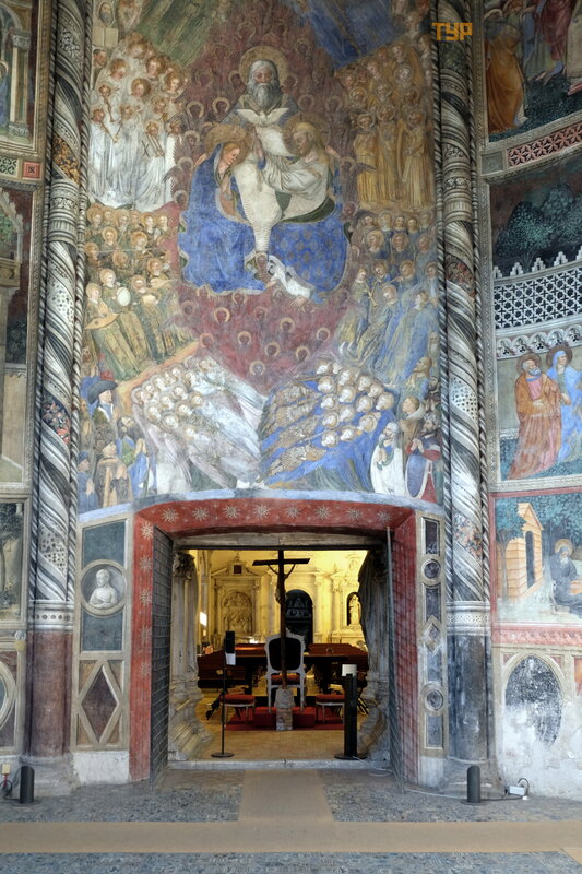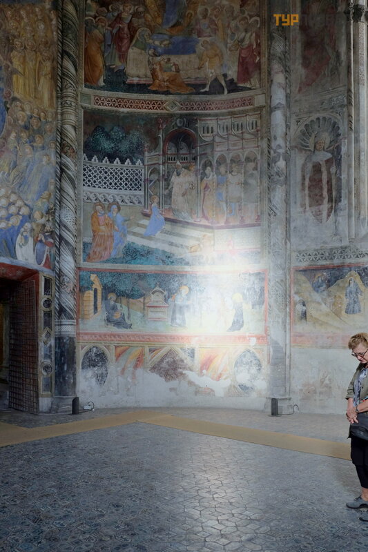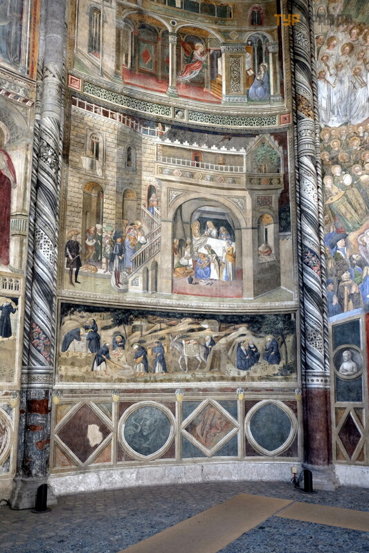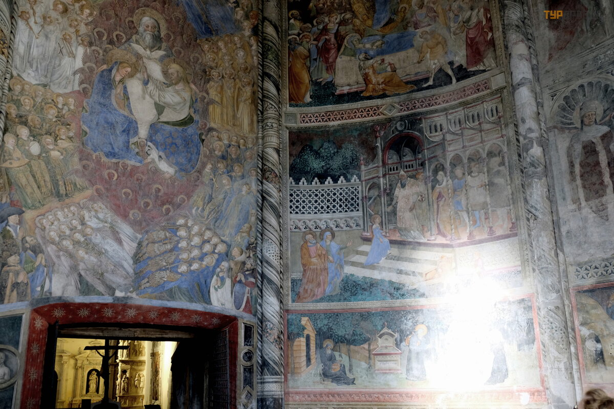 zdję cie. Kaplica ma pię kną posadzkę z maoliki i freski na temat Matki Boskiej i Są du Ostatecznego.
