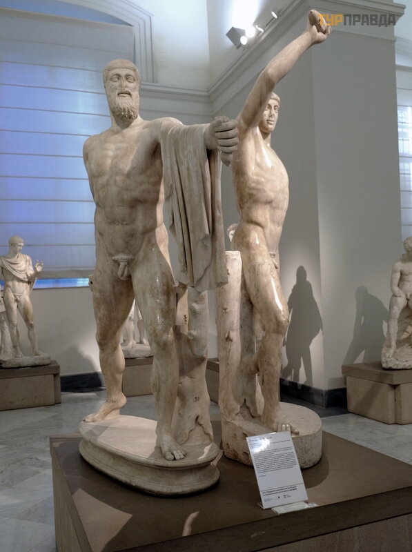 Lub „zabó jcy tyranó w” Aristogeiton i Harmodius (któ rzy stali się prototypem „robotnicy i kobiety z koł chozó w”) z II w. n. e. mi. kopia greckiego oryginał u, V wiek p. n. e mi.