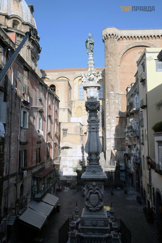 Idziemy na duż y Piazza San Domenico Maggiore (piazza San Domenico Maggiore), w centrum któ rego znajduje się obelisk ś w. Domenica, zaprojektowany przez architekta Cosimo Fanzago (1656-1658). Obelisk jest ozdobiony marmurowymi ornamentami i rzeź bami, z któ rych niektó re są autorstwa Lorenzo Vaccaro.