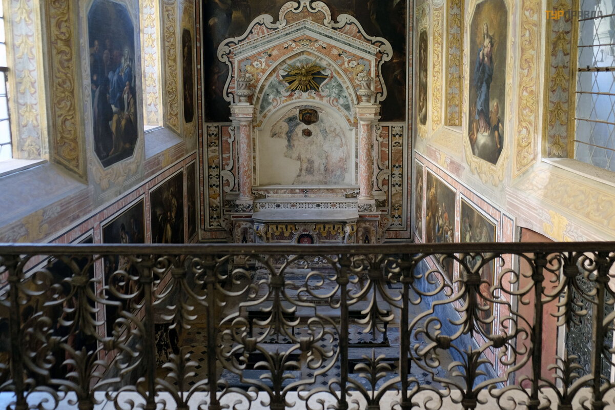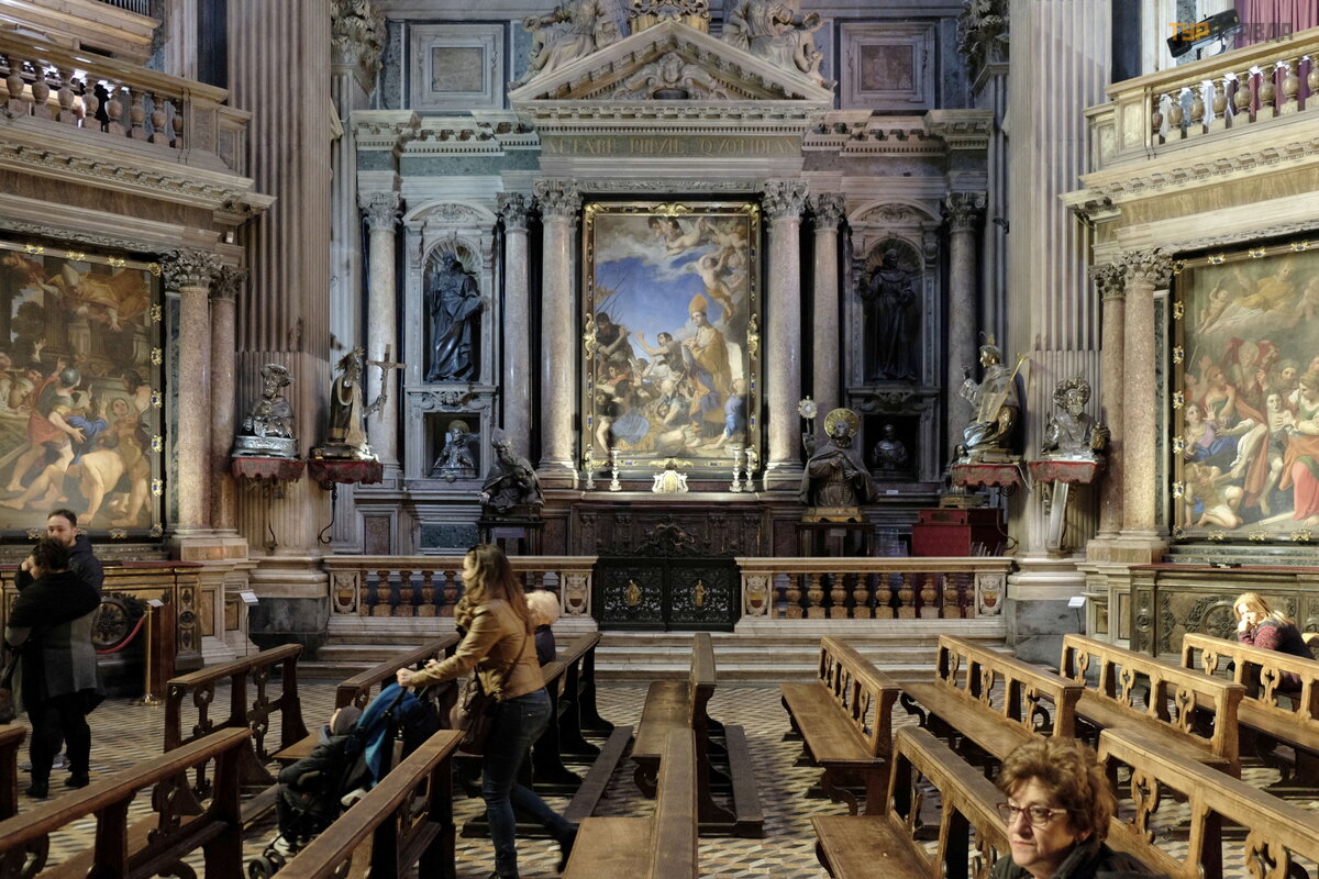 Oł tarz gł ó wny koś cioł a zdobi obraz Carravaggia, któ ry moż na zobaczyć z galerii na drugim pię trze.
